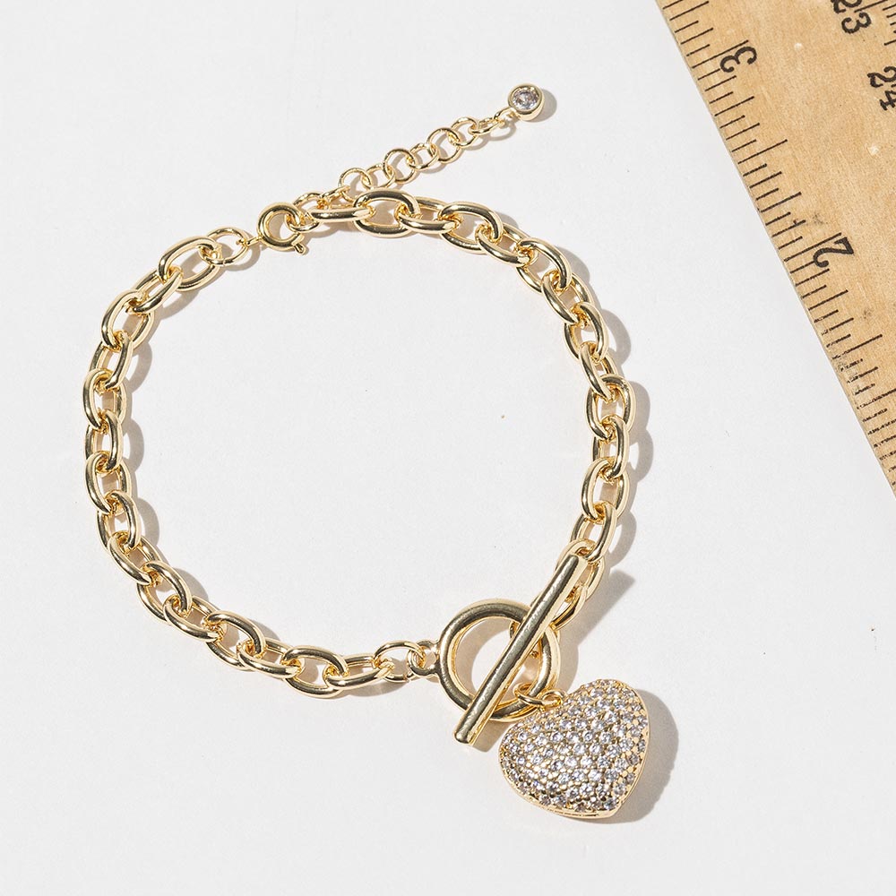Gold Dipped CZ Stone Paved Heart Toggle Charm Chain Bracelet