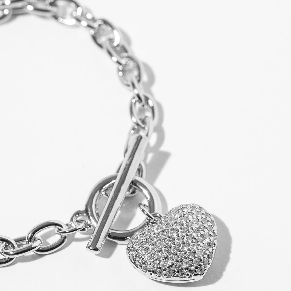 • A chic link bracelet featuring a shimmering heart charm adorned with cubic zirconia for added radiance. This elegant toggle-chain design offers a polished, stylish finish perfect for dressing up any look or adding everyday glamour. Ideal for layered styling or as a statement piece, it delivers classic charm with a modern twist.