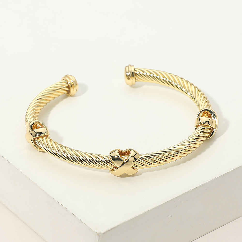 • Elegant open cuff bracelet featuring a twisted cable design with a sculpted heart accent at the center. Designed for easy wear and everyday styling, this timeless cuff adds a refined touch to casual and elevated looks, making it a versatile choice for boutiques, gifting, and layered jewelry collections.