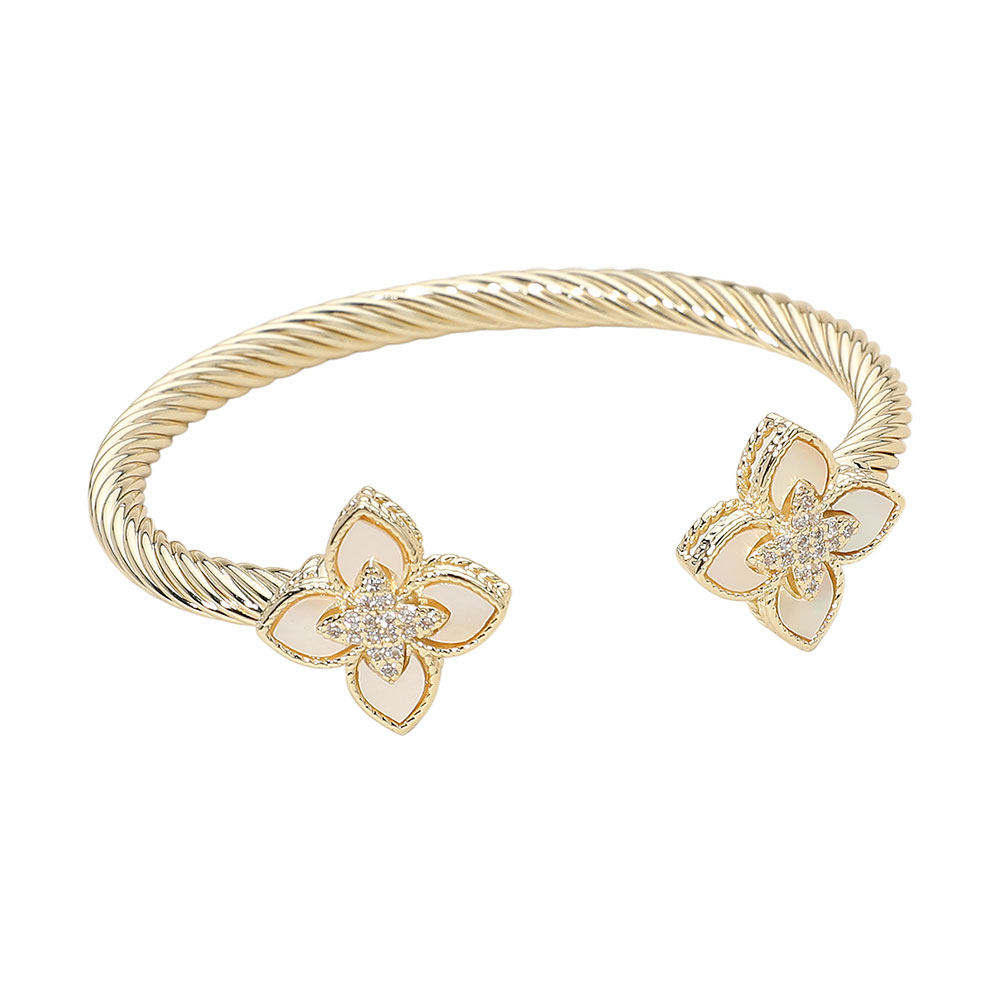 14K Gold Plated CZ Stone Paved Center Mother of Pearl Floral Clover Tip Cuff Bracelet 14K Gold Plated CZ Stone Paved Center Mother of Pearl Floral Clover Tip Cuff Bracelet