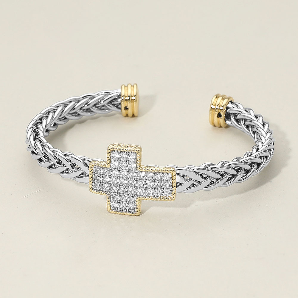 Details • Size : 0.75" H, 2.4" D • Cuff • This elegant cuff bracelet features a refined braided band and a striking cz stone paved cross centerpiece designed with intricate detailing for added dimension. Its open-ended structure allows for easy wear, making it a meaningful accessory that blends style with symbolic significance for any occasion. • CZ Cubic Zirconia