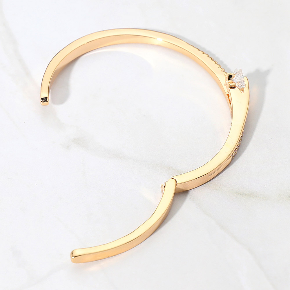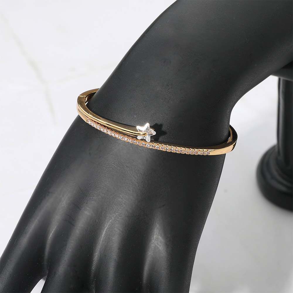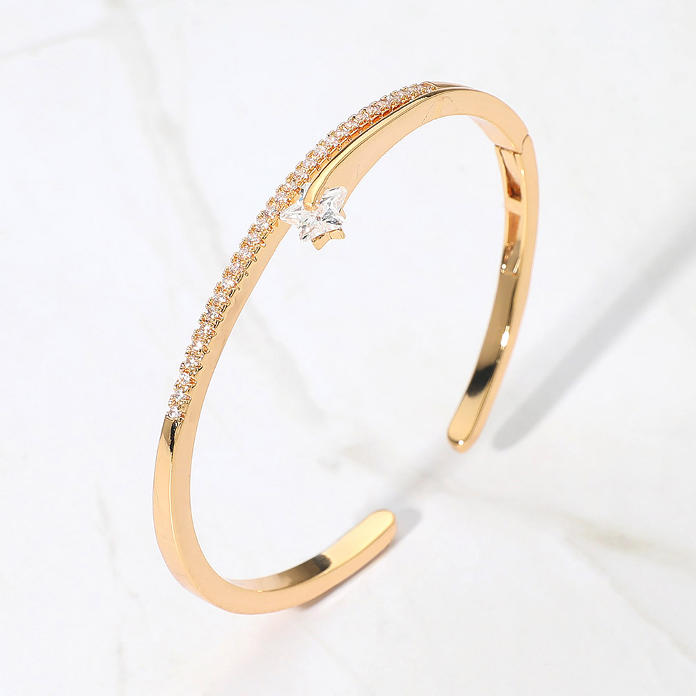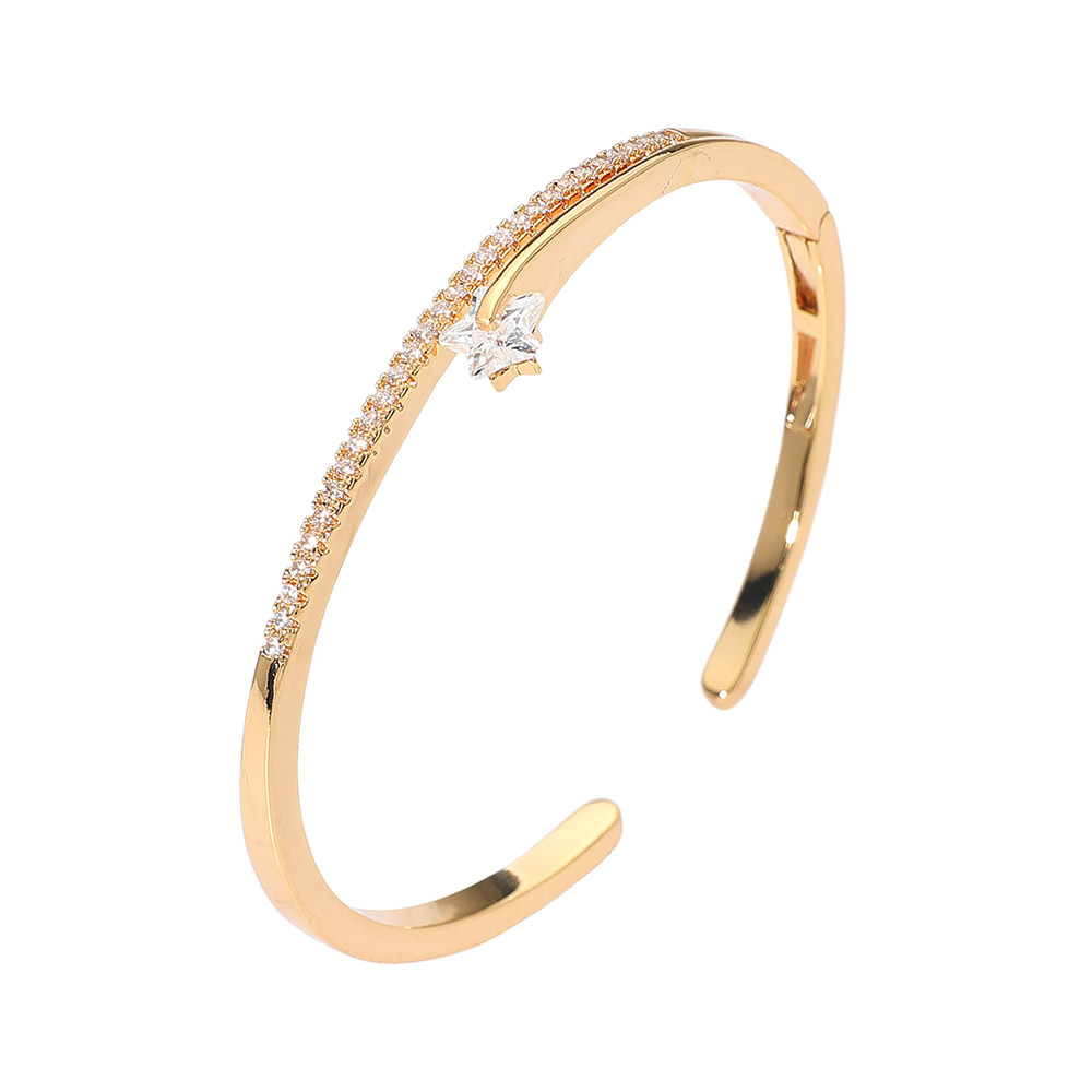 Details • Size : 0.2" H, 2.25" D • Cuff / Hinged Closure • Add a touch of brilliance with this open cuff bracelet featuring a delicate star accent and a shimmering line of crystals. Designed for effortless sophistication, it pairs beautifully with both casual and formal looks, offering a refined, modern statement for any occasion. • Gold Dipped