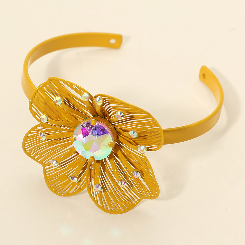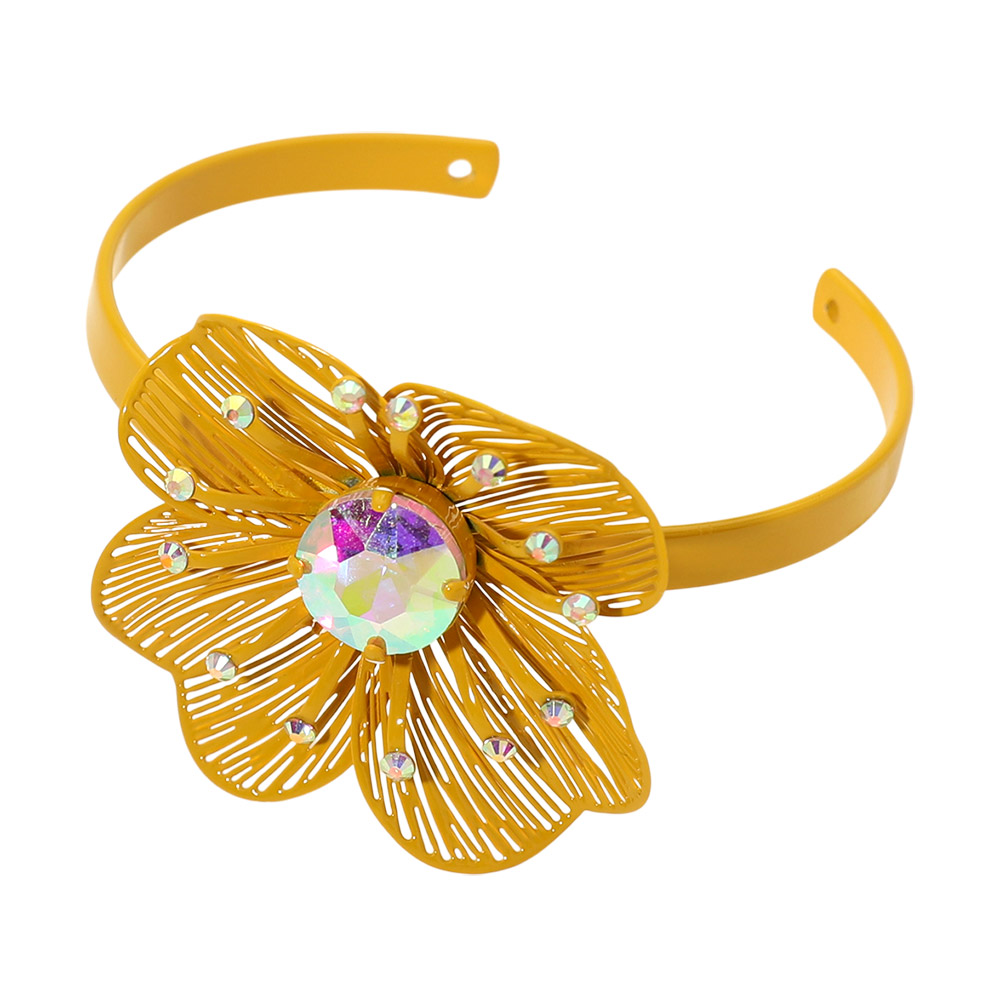 Details • Size : 1.5" H, 2.3" D • Cuff • Statement cuff bracelet featuring a bold floral design with a faceted center accent and delicate crystal details. Designed to stand out with sculptural petals and eye-catching shine, this cuff adds artistic flair and elegant impact to everyday outfits or special occasion styling. • Lead and Nickel Compliant