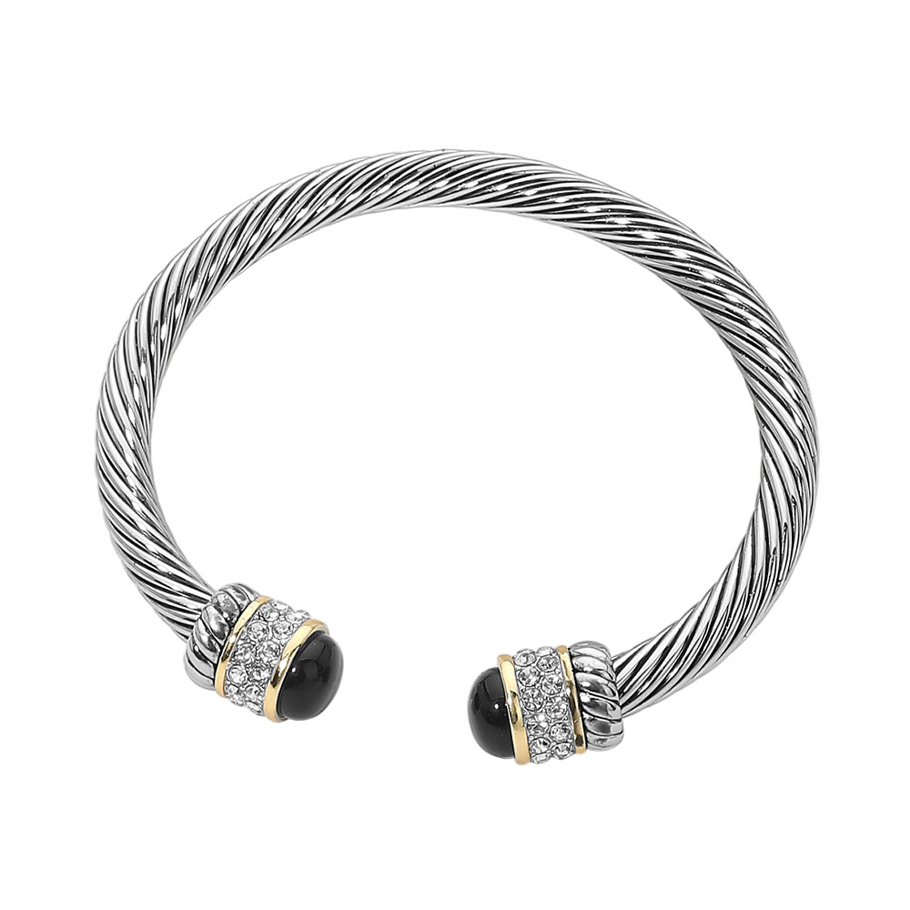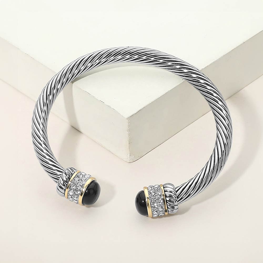 • Sleek open cuff bracelet featuring a twisted cable silhouette with polished end accents and crystal detailing. Designed for easy slip-on wear, this structured cuff adds a refined, modern touch to everyday outfits and elevated looks, making it a versatile option for gifting, boutiques, and layered jewelry styling.