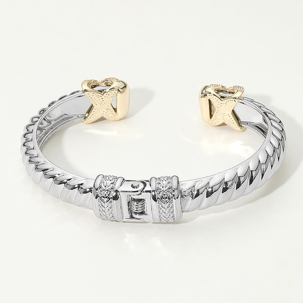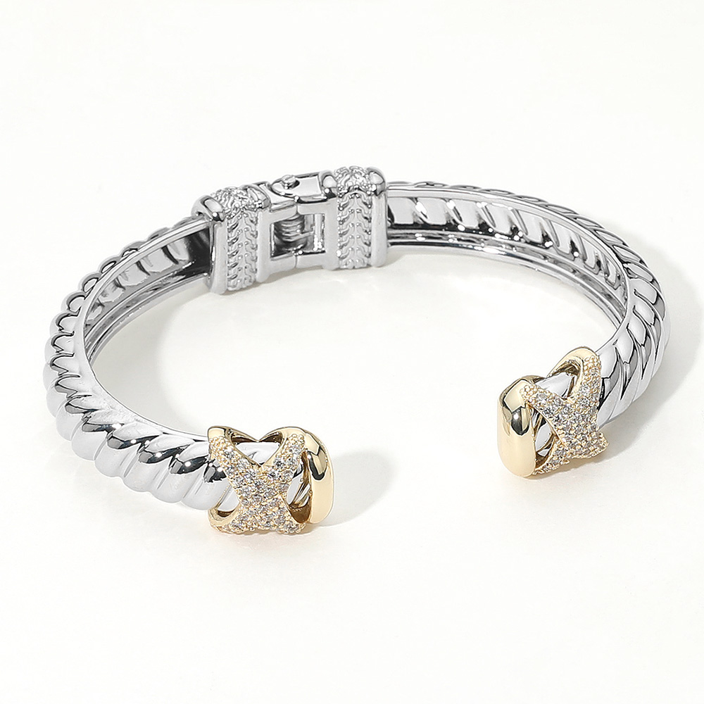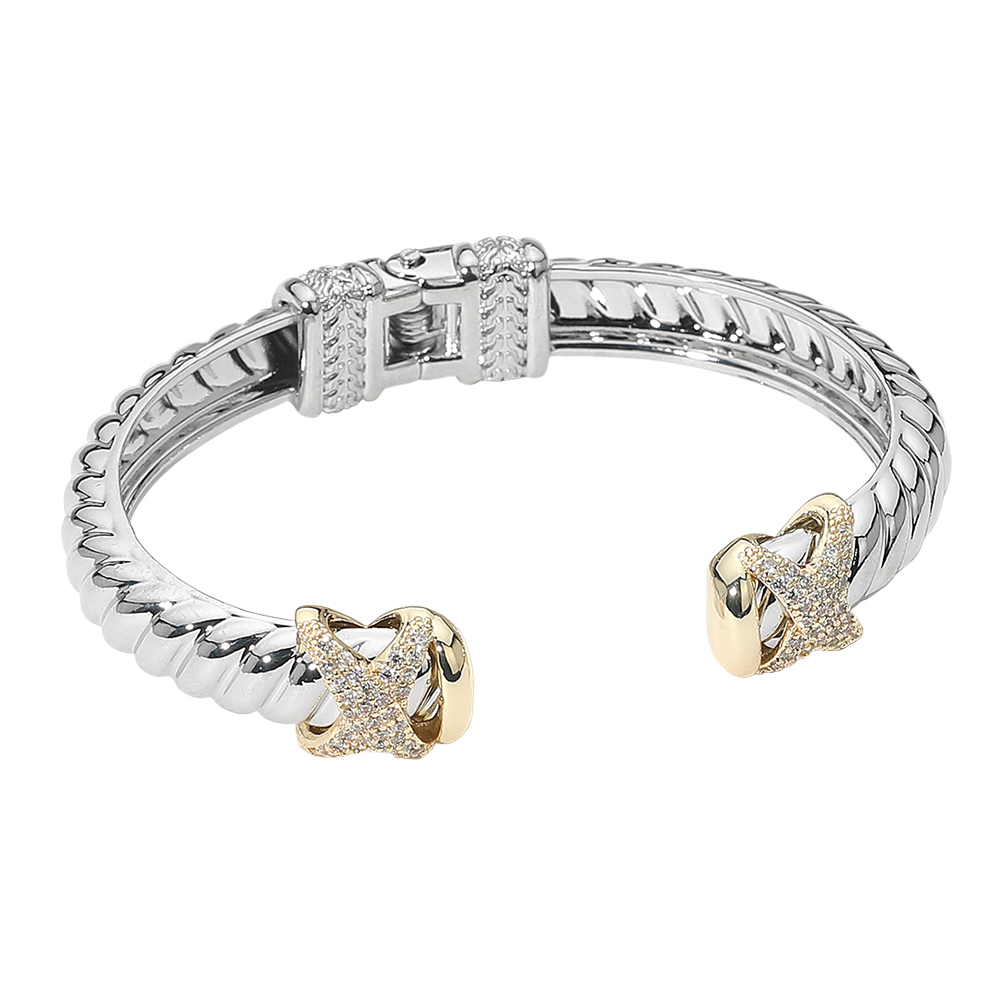 Details • Size : 0.5" H, 2.6" D • Hinged Closure / Cuff • Add sophistication to your jewelry collection with this elegant two-tone cuff bracelet featuring an X design adorned with sparkling accents. Perfect for both casual and formal wear, this timeless bracelet offers versatile style and modern charm for everyday elegance or special occasions. • CZ Cubic Zirconia