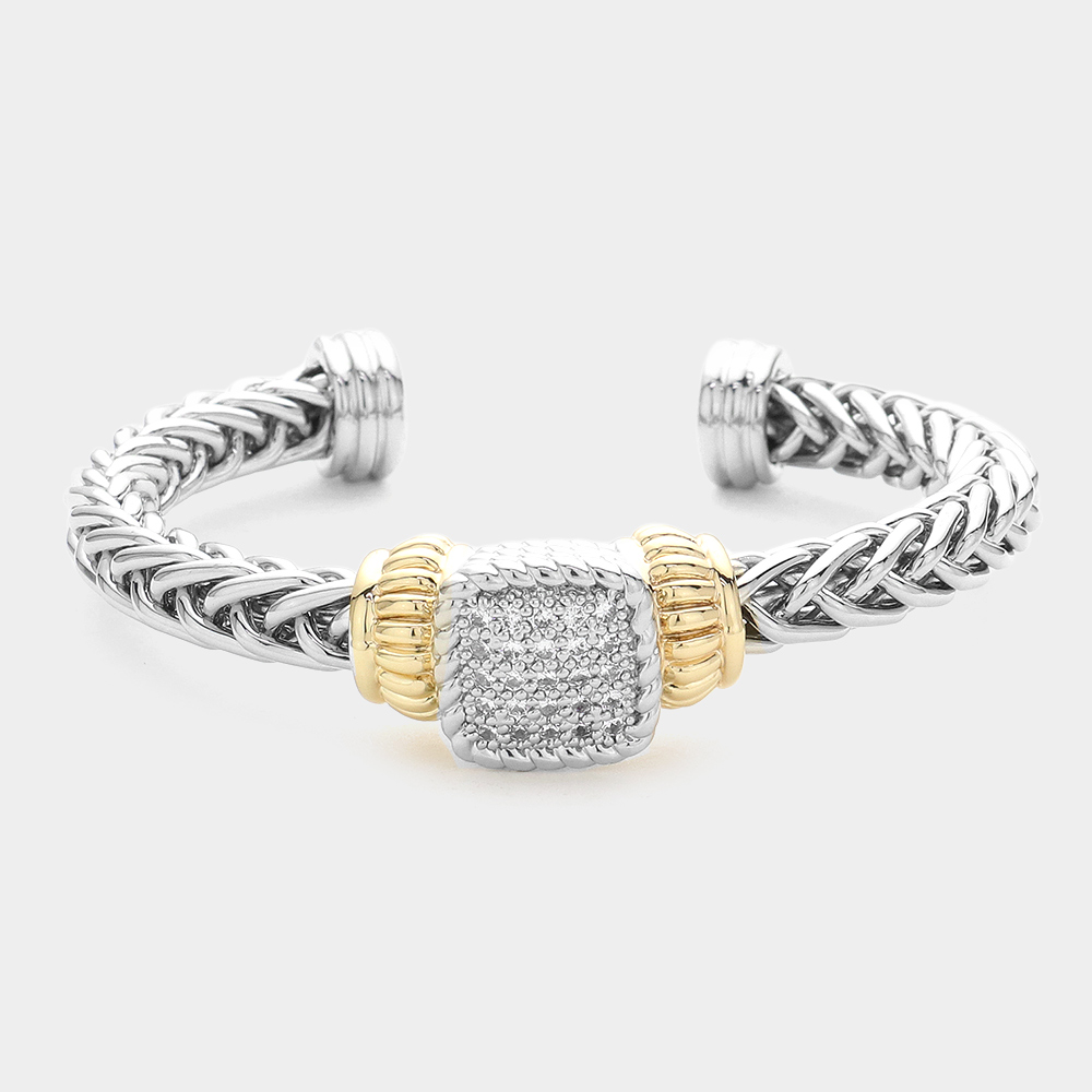 CZ Stone Paved Square Pointed Braided Metal Cuff Bracelet