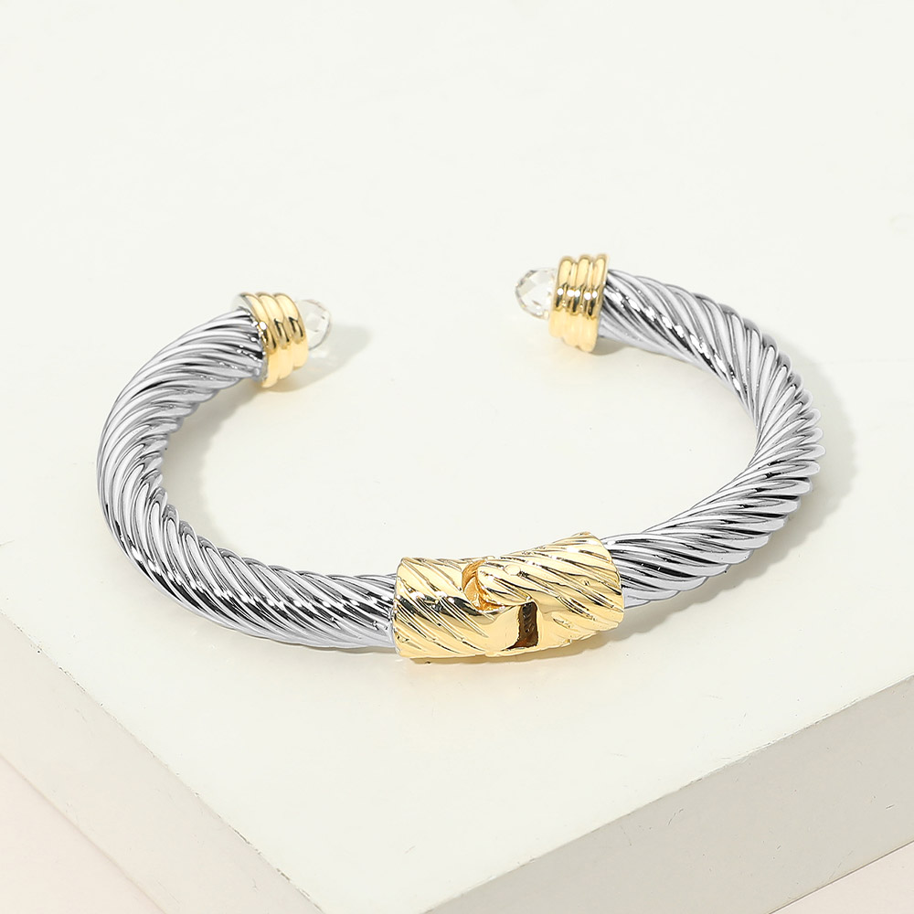 Details • Size : 0.4" H, 2.5" D • Cuff / Hinged Closure • Sleek open cuff bracelet showcasing a twisted cable silhouette with polished end accents and a structured center detail. Designed for an easy slip-on fit, this statement piece blends modern edge with timeless appeal, making it ideal for stacking, gifting, or elevating everyday and occasion-ready jewelry assortments.