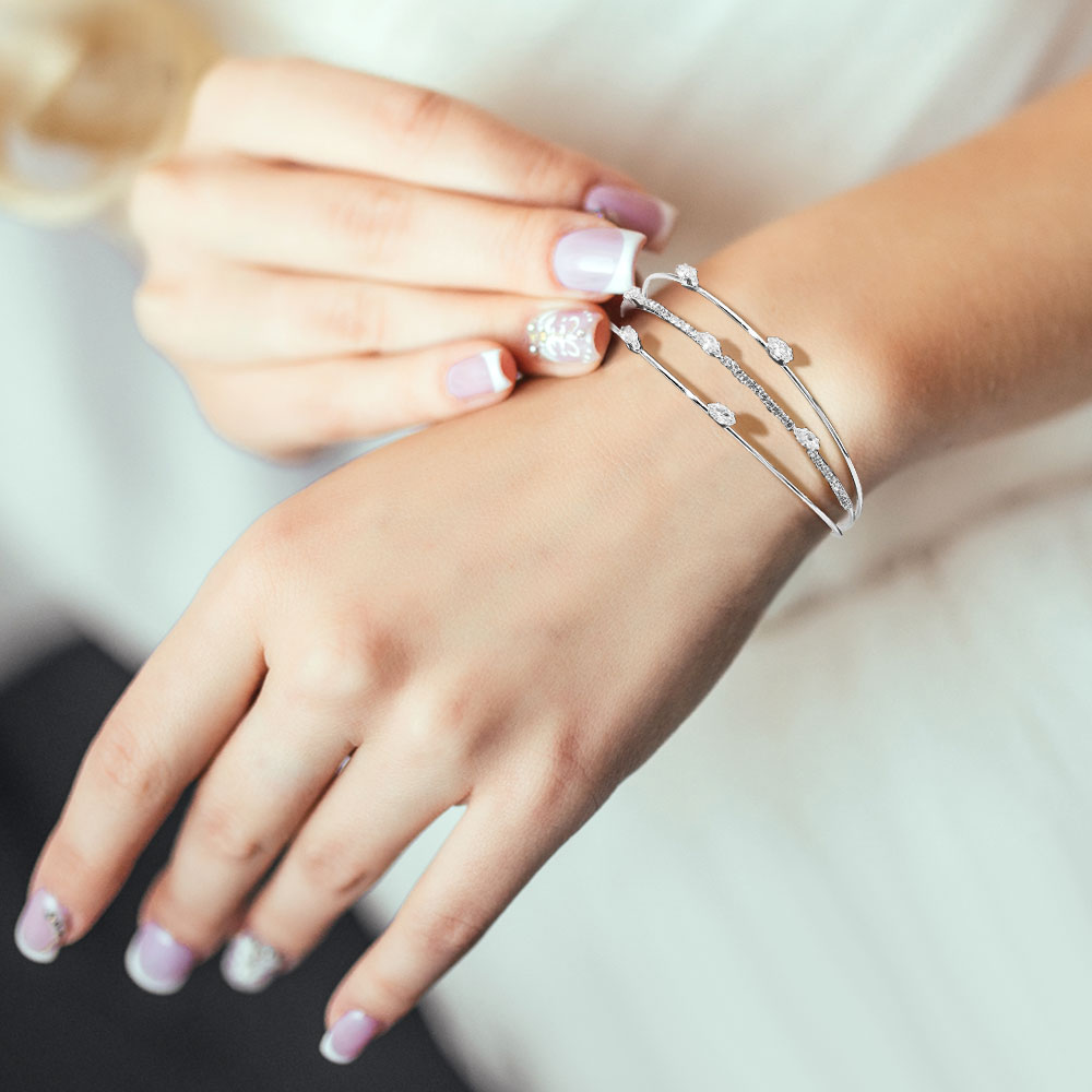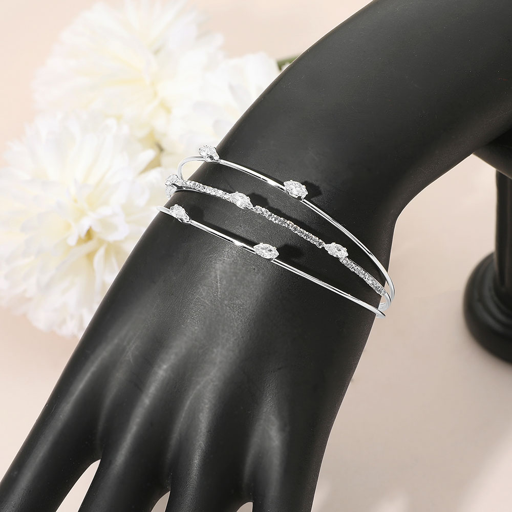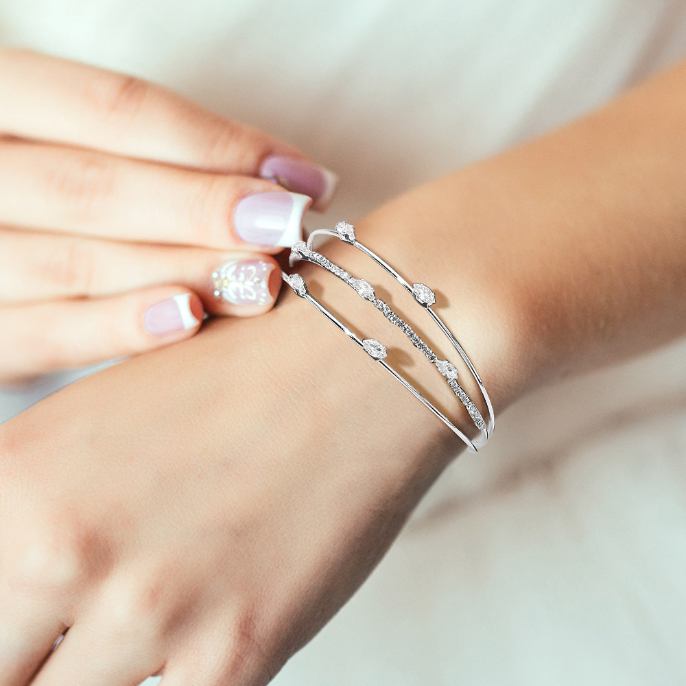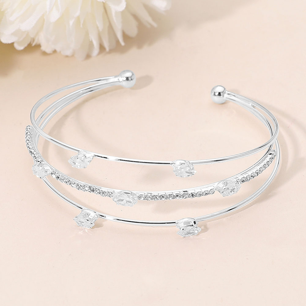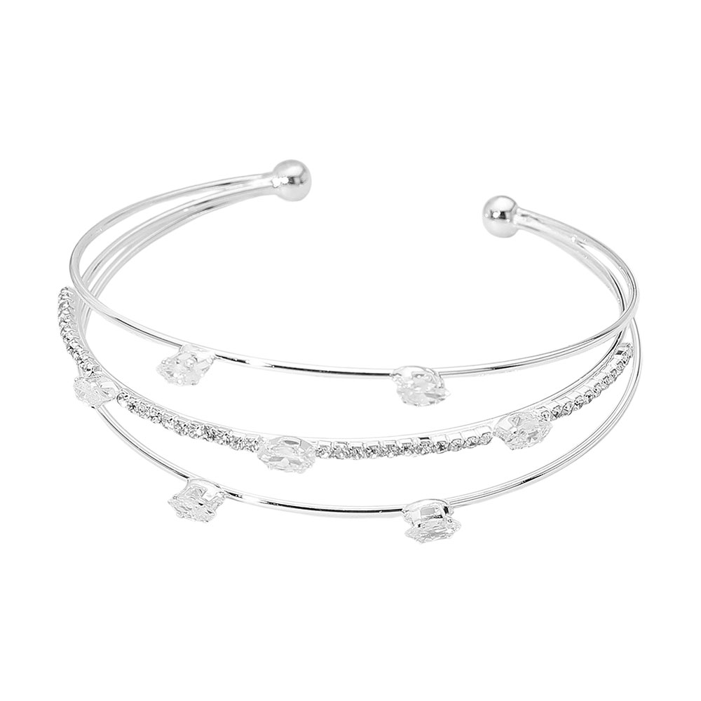 Details • Size : 0.6" H, 2.4" D • Cuff • This open cuff crystal bangle offers refined elegance with its layered design and delicate sparkle. The modern silhouette combines sophistication and versatility, making it an ideal statement piece for elevating both formal and casual looks with understated glamour and timeless charm. • CZ Cubic Zirconia • Lead and Nickel Compliant