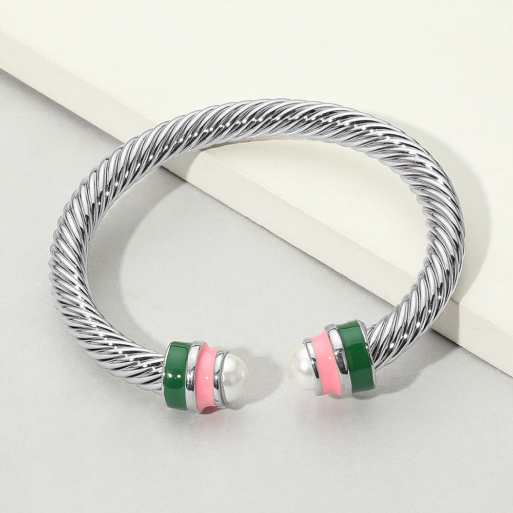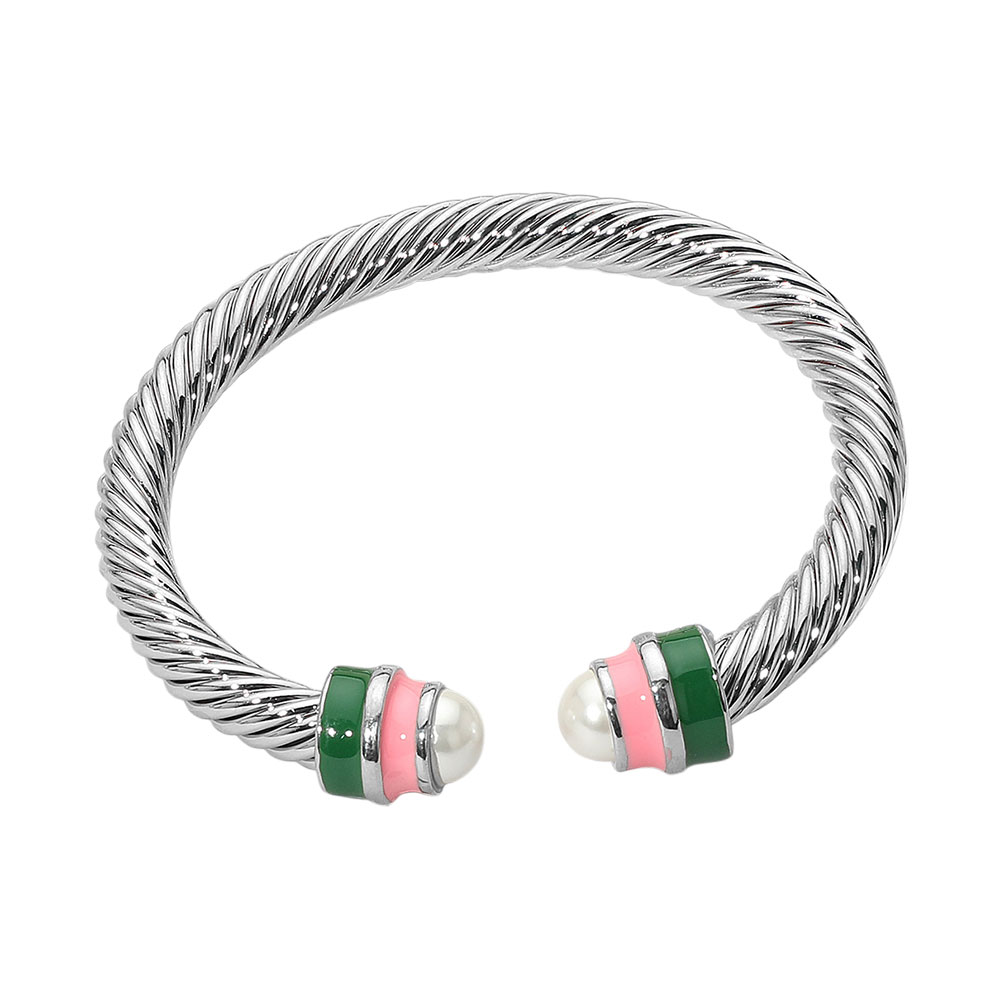 • Add a vibrant touch to your style with this elegant twisted cable cuff bracelet, featuring a sleek silver-tone finish adorned with green and pink enamel accents and pearl-like tips. Its open cuff design ensures a comfortable fit while offering a modern yet timeless accessory for any occasion.