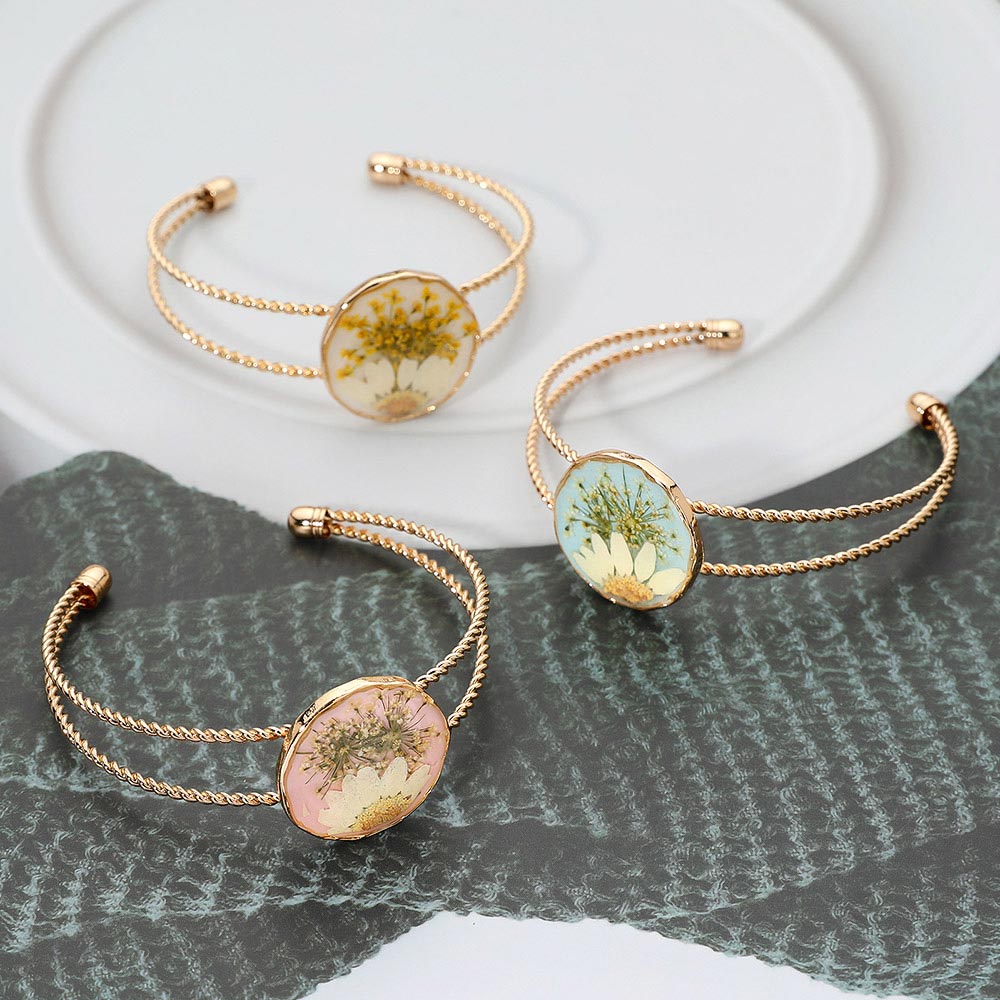• A charming cuff bracelet featuring a double-band twisted design and a round resin center showcasing preserved floral details. Its nature-inspired aesthetic adds soft elegance to any outfit, making it perfect for daily wear, gifting, or adding a unique boho touch to your accessories.