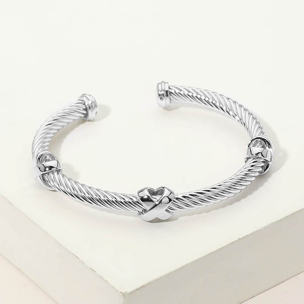 Details • Size : 0.3" H, 2.3" D • Cuff • Elegant open cuff bracelet featuring a twisted cable design with a sculpted heart accent at the center. Designed for easy wear and everyday styling, this timeless cuff adds a refined touch to casual and elevated looks, making it a versatile choice for boutiques, gifting, and layered jewelry collections.