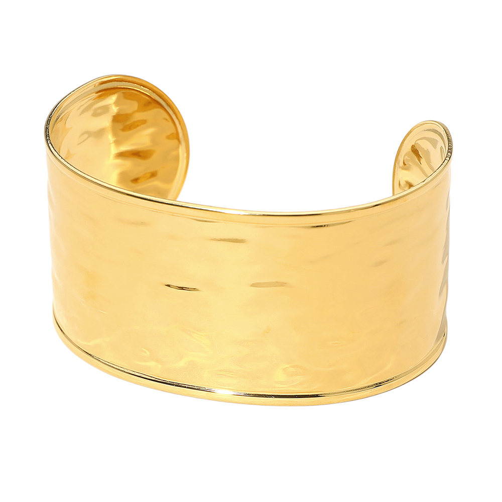 Details • Size : 1.4" H, 2.6" D • Cuff • Water & Tarnish Resistant • Elevate your look with this wide cuff statement bracelet featuring a smooth curved silhouette and subtle hammered texture. Designed for easy slip-on wear, it adds bold, modern elegance to casual and dress outfits alike while offering a versatile accessory ideal for stacking, solo styling, or gifting. • Stainless Steel