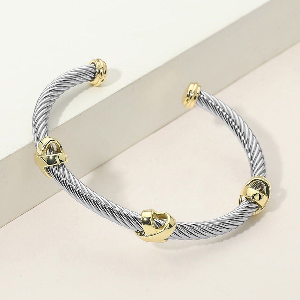 • Elegant open cuff bracelet featuring a twisted cable design with a sculpted heart accent at the center. Designed for easy wear and everyday styling, this timeless cuff adds a refined touch to casual and elevated looks, making it a versatile choice for boutiques, gifting, and layered jewelry collections.