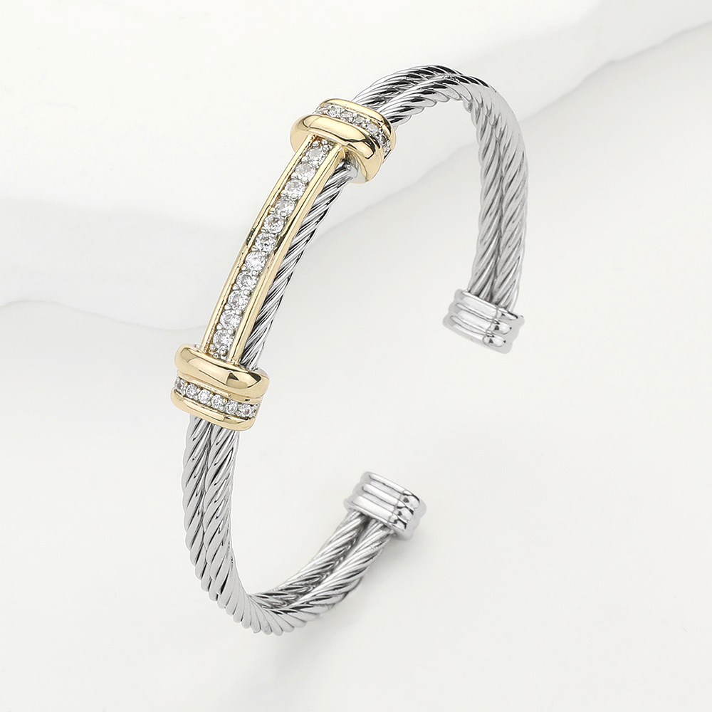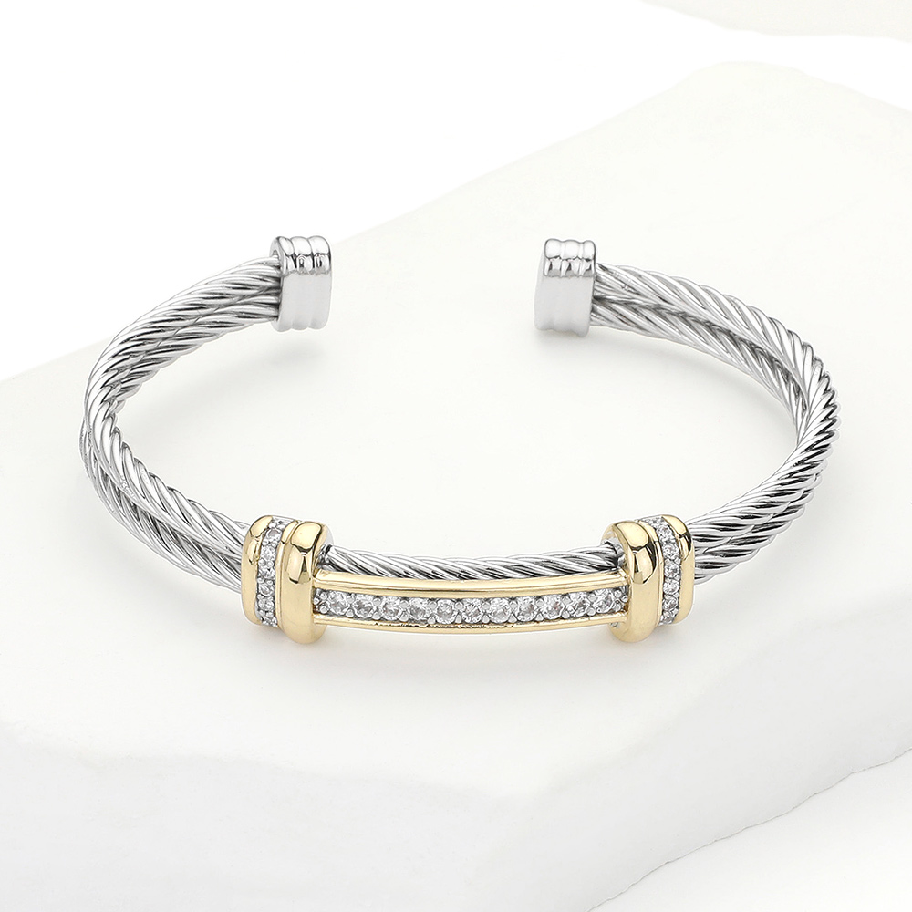 Two Tone CZ Stone Paved Rope Cuff Bracelet