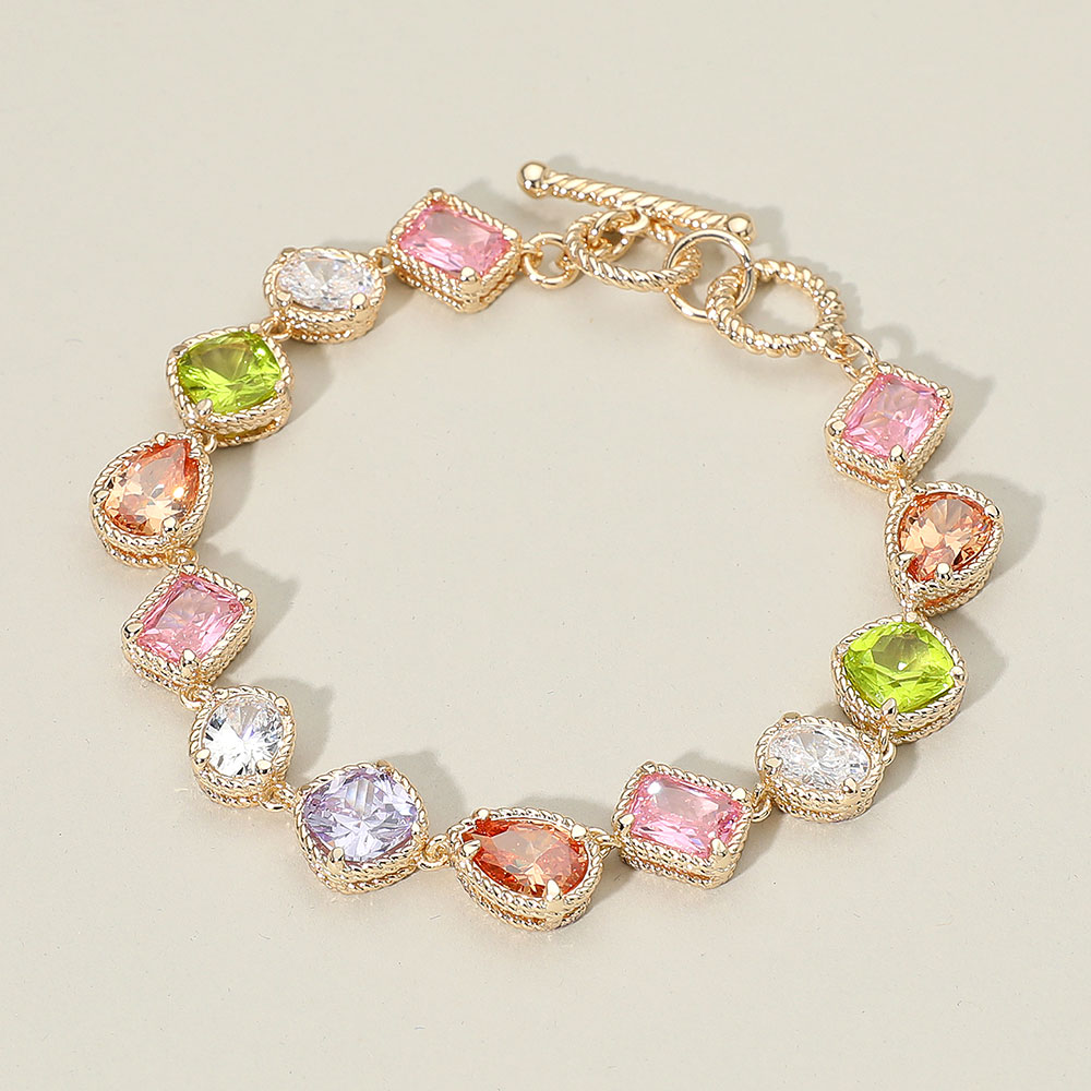 Details • Size : 0.4" H, 7.25" + 1" L • Toggle Closure • Add a vibrant touch to your style with this multi-shape stone gem accent bracelet. Each faceted stone shimmers in a variety of eye-catching tones, creating a stunning and elegant look. The refined gold-tone setting enhances its brilliance, making it a perfect accessory for any occasion. • CZ Cubic Zirconia • Gold Dipped