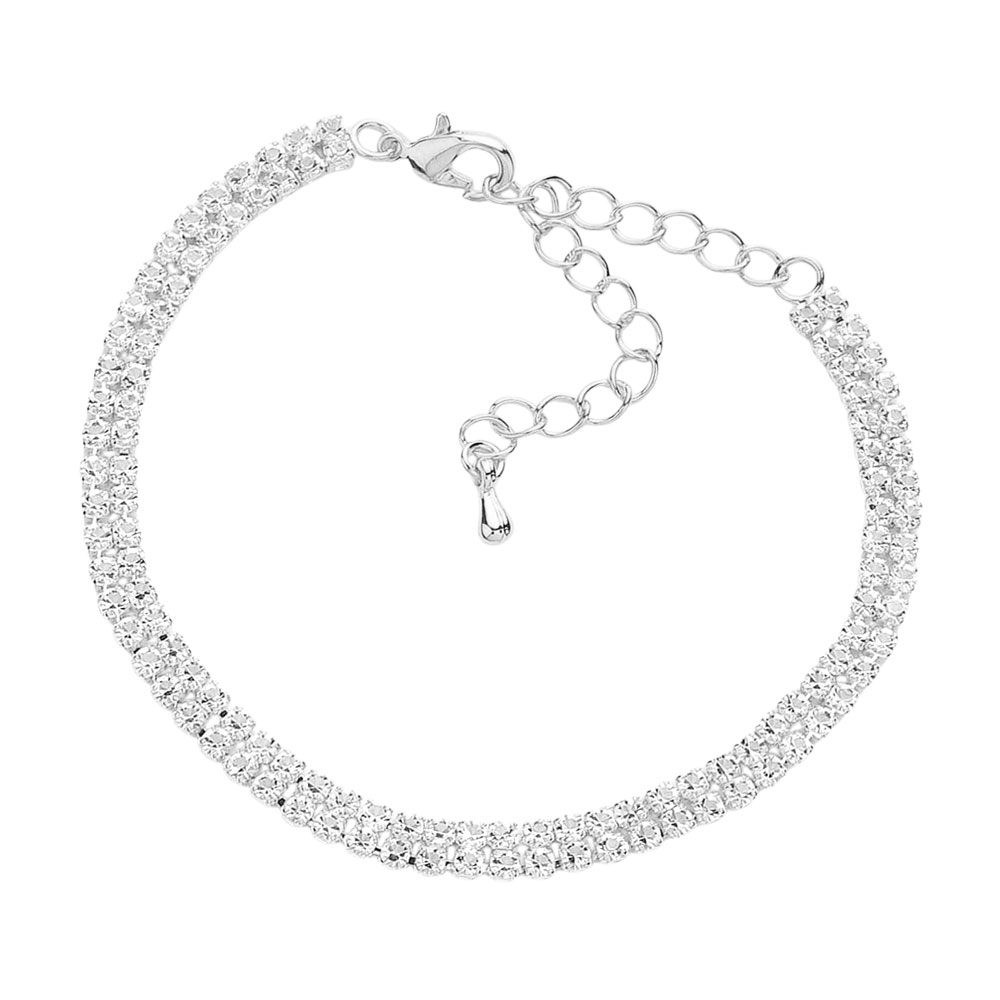Details • Size : 0.2" H, 7" + 2" L • Lobster Clasp Closure • This double row crystal chain bracelet radiates classic elegance and sparkle. Designed for a refined, polished look, it enhances any outfit with shimmering detail. Perfect for weddings, parties, or everyday sophistication, this bracelet is a timeless piece for effortless glamour. • Lead and Nickel Compliant • CZ Cubic Zirconia