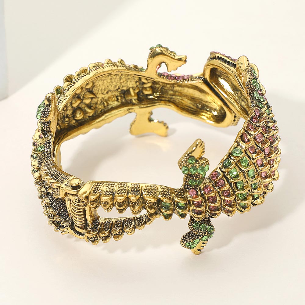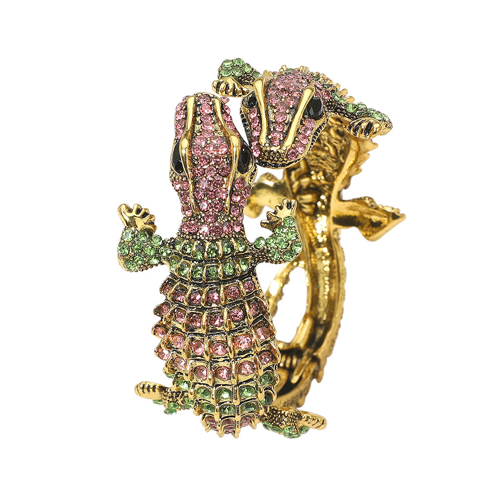 • Make a bold statement with this crystal-studded alligator cuff bracelet. Featuring twin alligator designs encrusted with sparkling rhinestones, this hinged bangle brings fierce style and eye-catching detail to any outfit. A standout piece for animal lovers and fashion risk-takers.