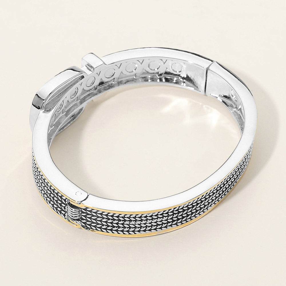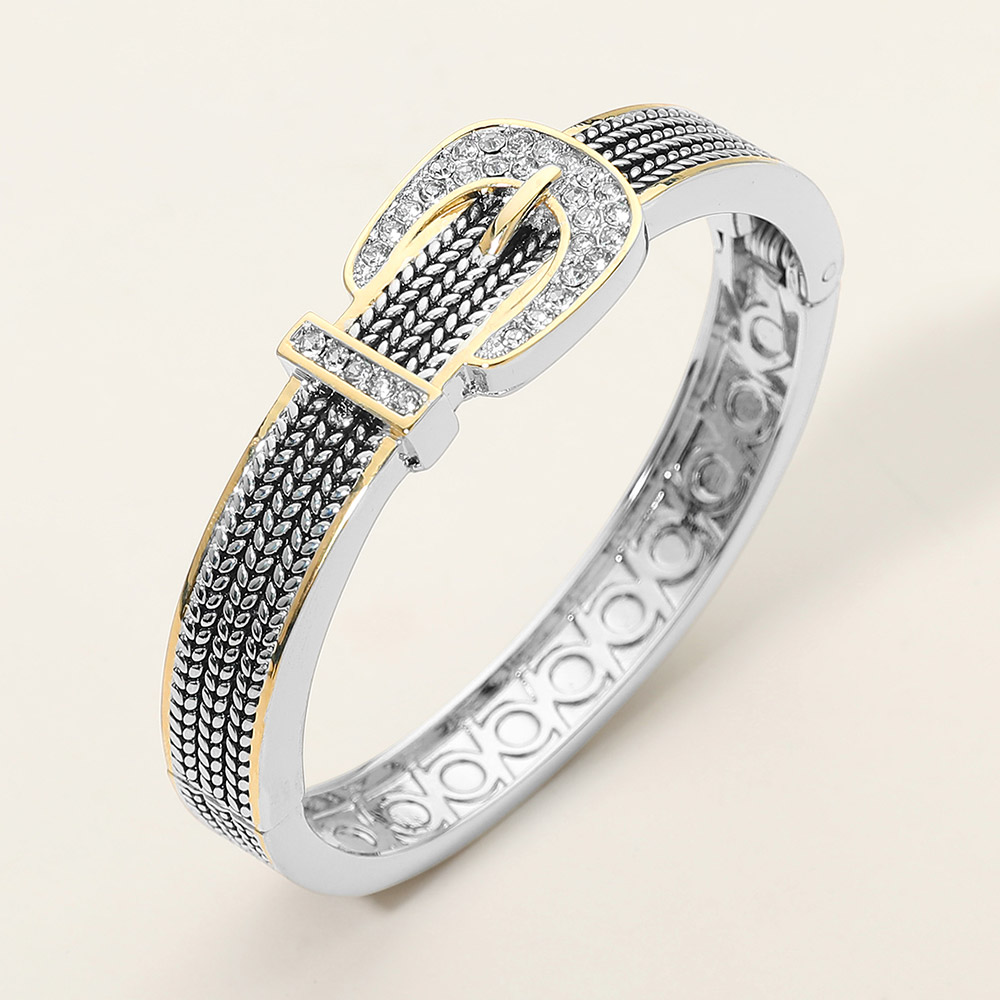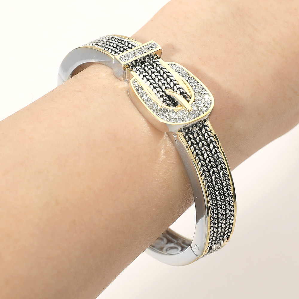 Details • Size : 0.75" H, 2.5" D • Hinged Closure • Statement hinged bangle bracelet featuring a bold buckle-inspired design with textured detailing and a sparkling accent. Structured silhouette provides a secure, comfortable fit for everyday wear or special occasions. Perfect worn alone or stacked, ideal for boutiques seeking modern, elevated jewelry pieces. • CZ Cubic Zirconia