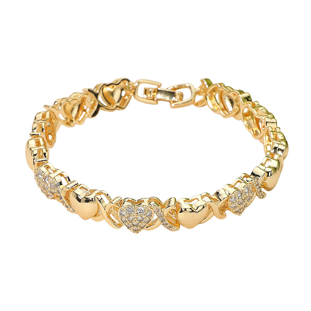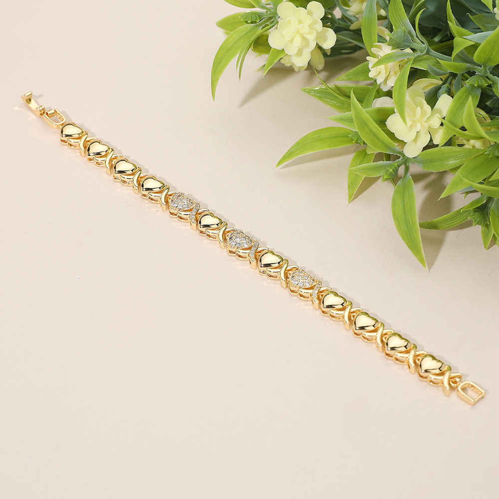 Details • Size : 0.3" H, 7.25" L • Fold Over Closure • This heart link bracelet features an intricate pattern of connected hearts accented with shimmering crystals. Designed to capture timeless romance and refined elegance, it’s perfect for adding a delicate sparkle to your look, making it ideal for both special occasions and daily wear. • Brass • CZ Cubic Zirconia