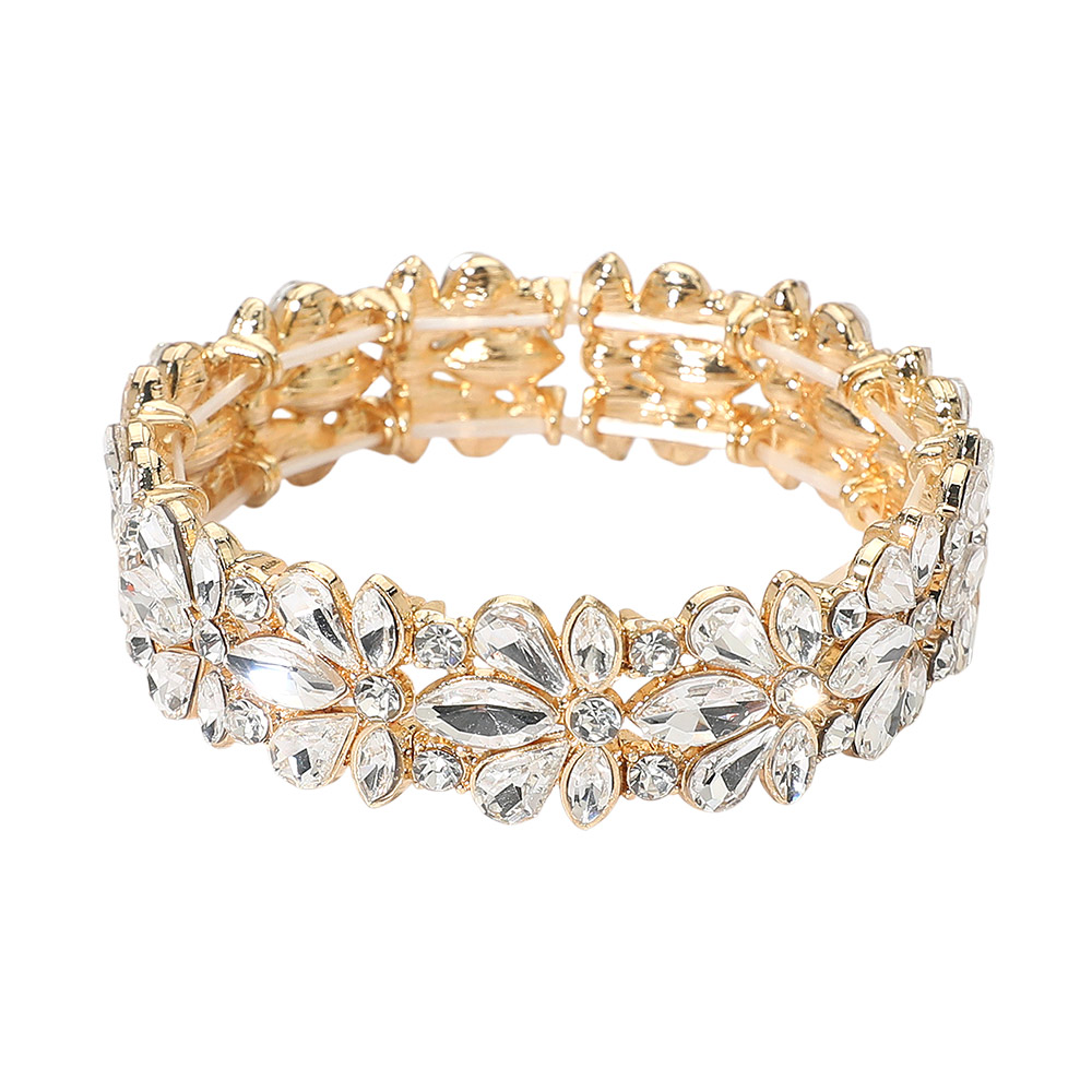 • An elegant stretch bracelet featuring layered floral detailing with a radiant, eye-catching finish. Designed for comfortable slip-on wear, ideal for parties, weddings, formal events, and special occasions, delivering refined style and glamour to elevate any outfit.