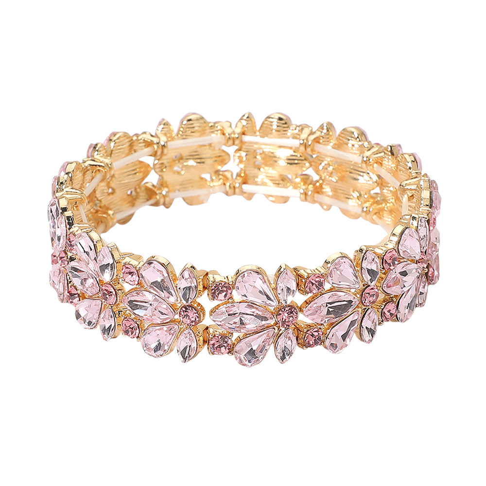 • An elegant stretch bracelet featuring layered floral detailing with a radiant, eye-catching finish. Designed for comfortable slip-on wear, ideal for parties, weddings, formal events, and special occasions, delivering refined style and glamour to elevate any outfit.