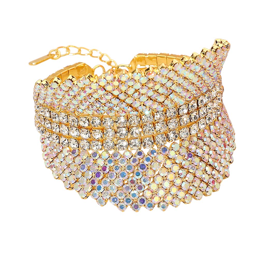 • Add refined sparkle to your look with this layered crystal evening bracelet. Designed with multiple rows of luminous stones that catch every glimmer of light, it exudes timeless sophistication. The adjustable clasp ensures comfort, making it perfect for formal events or chic nights out.
