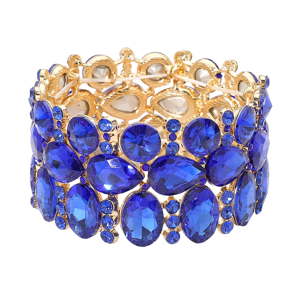 Details • Size : 1.6" H, 2.5" D • Stretchable • This elegant gemstone statement bracelet dazzles with a stunning mix of oval and round-cut stones arranged in an intricate pattern. Designed to catch the light from every angle, it adds sophistication and glamour to any ensemble—perfect for special occasions or evening wear. • Lead and Nickel Compliant