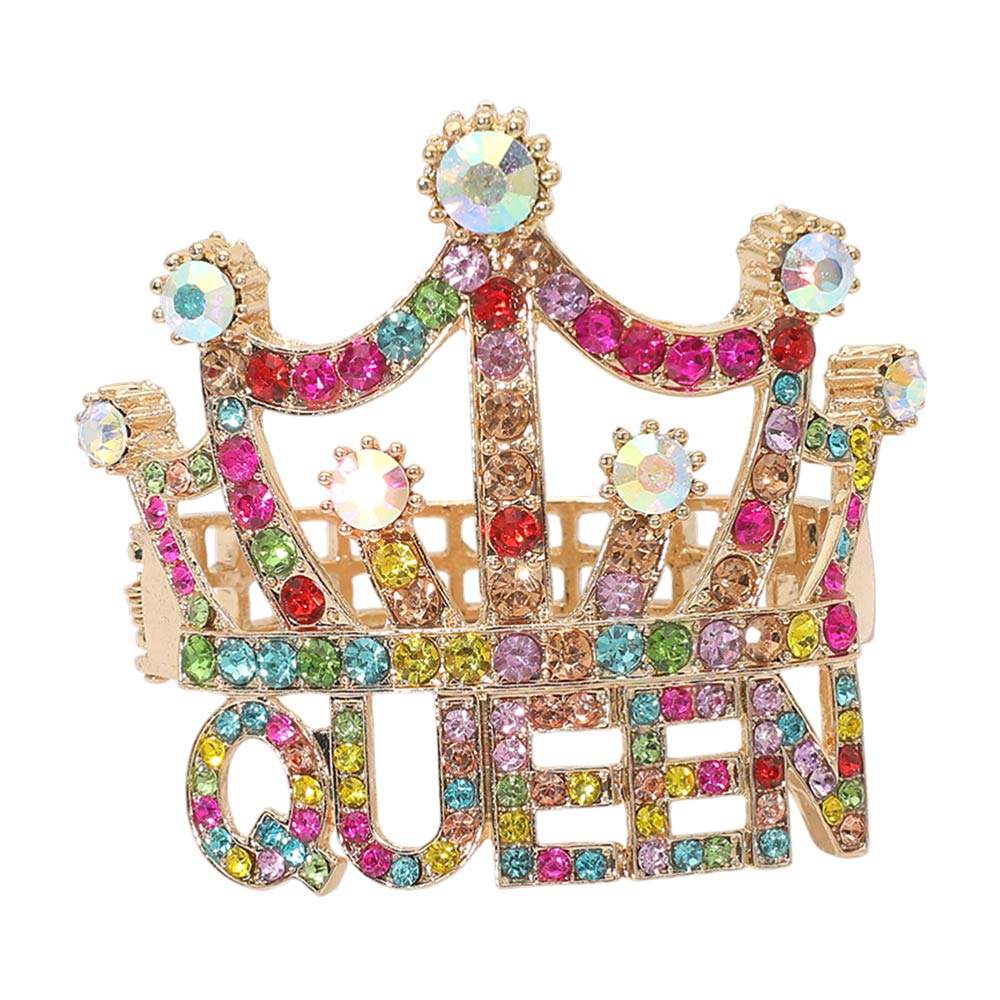 Details • Size : 3" H, 2.5" D • Hinged Closure • This queen crown statement brooch features a bold crown silhouette with sparkling stone accents and a raised QUEEN lettering design. A striking accessory for jackets, dresses, bags, or hats, perfect for fashion-forward styling, gifting, pageant looks, event wear, and boutique jewelry collections seeking a confident, eye-catching statement piece. • Lead and Nickel Compliant