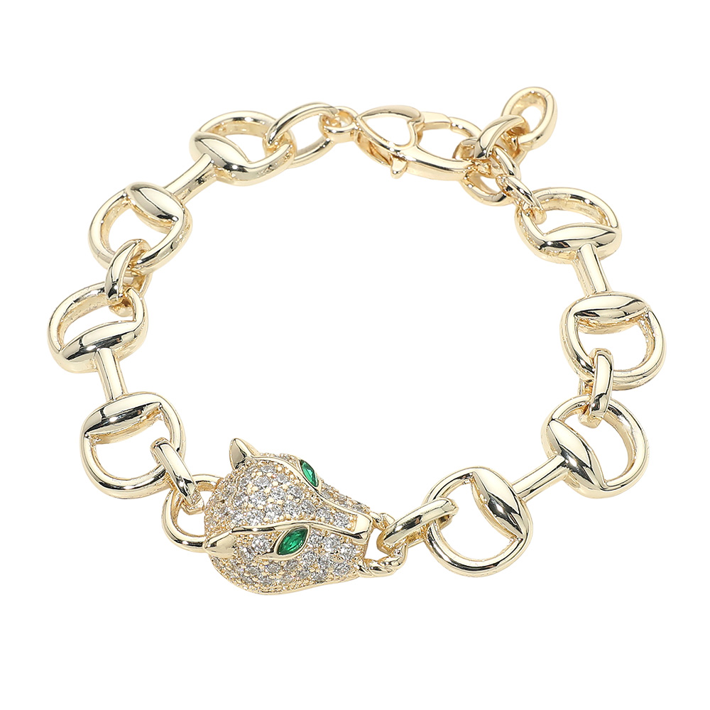 Details • Size : 0.6" H, 7.25" + 1" L • Lobster Clasp Closure • This statement link bracelet features bold chain styling finished with a detailed animal-inspired clasp that becomes the focal point of the design. Designed for standout wrist appeal, it offers a secure closure and comfortable fit while elevating everyday or evening looks. A strong choice for boutiques seeking eye-catching bracelets that combine modern edge, trend-driven charm, and versatile styling for curated accessory collections. • Gold Dipped • CZ Cubic Zirconia