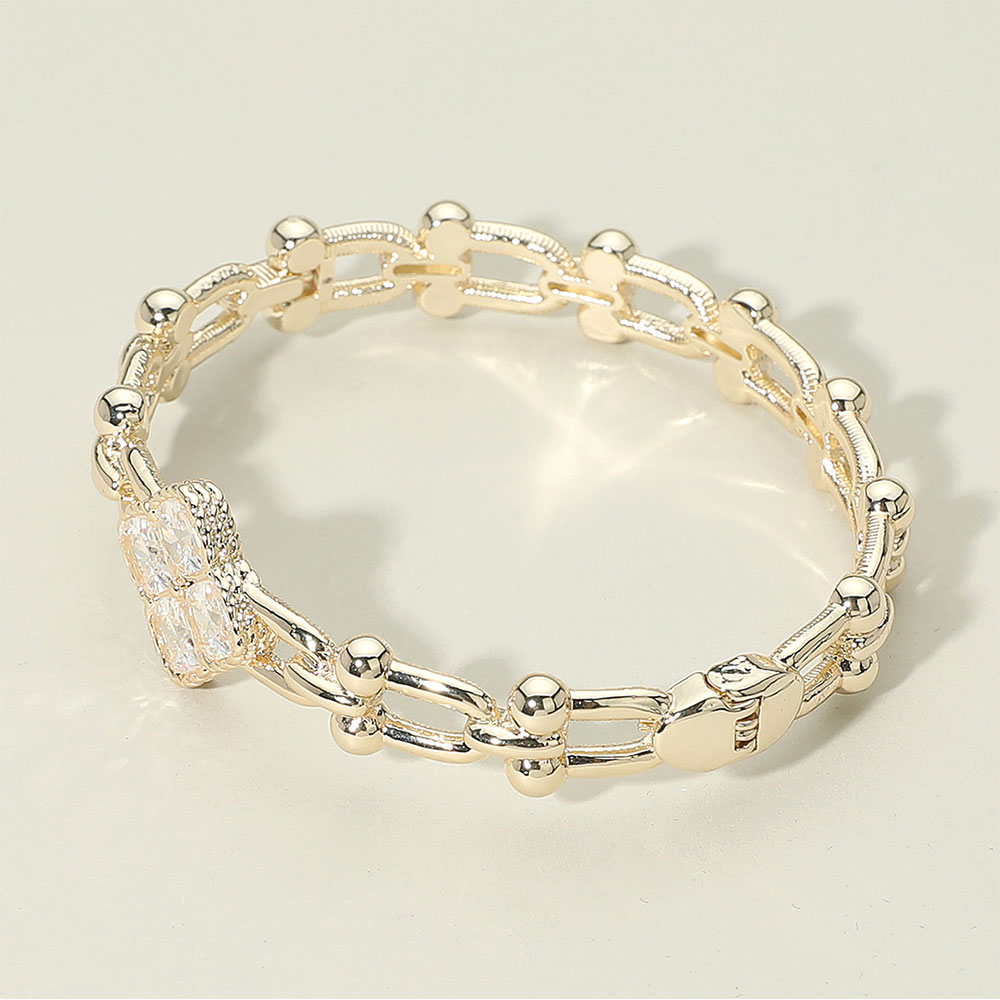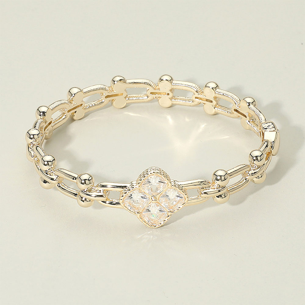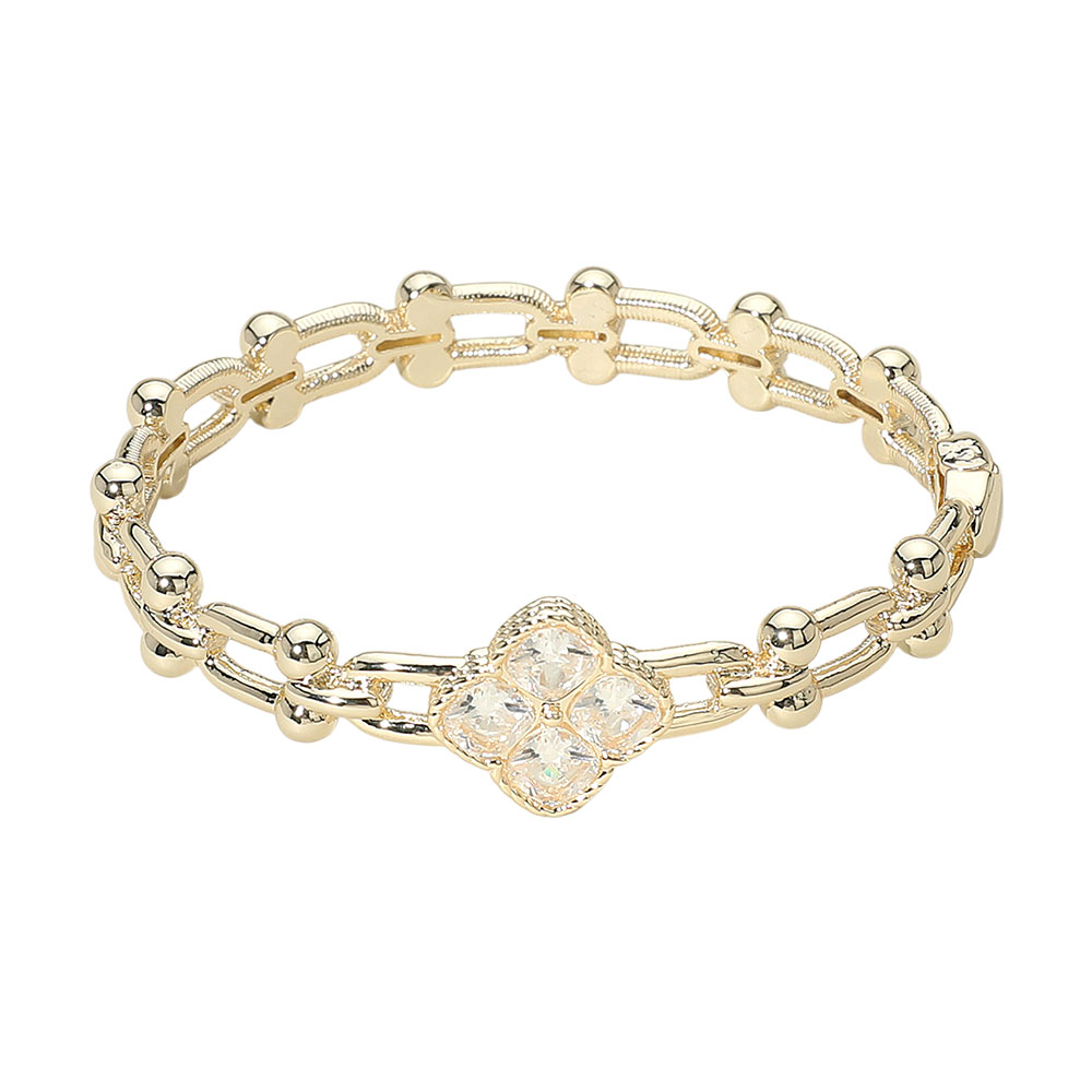Details • Size : 0.75" H, 2.5" D • Hinged Closure • Elegant link bracelet featuring a delicate clover centerpiece adorned with sparkling crystals. The double-link design with beaded accents adds dimension and charm, making it a versatile accessory that complements both casual and dressy looks with timeless sophistication. • CZ Cubic Zirconia • Gold Dipped