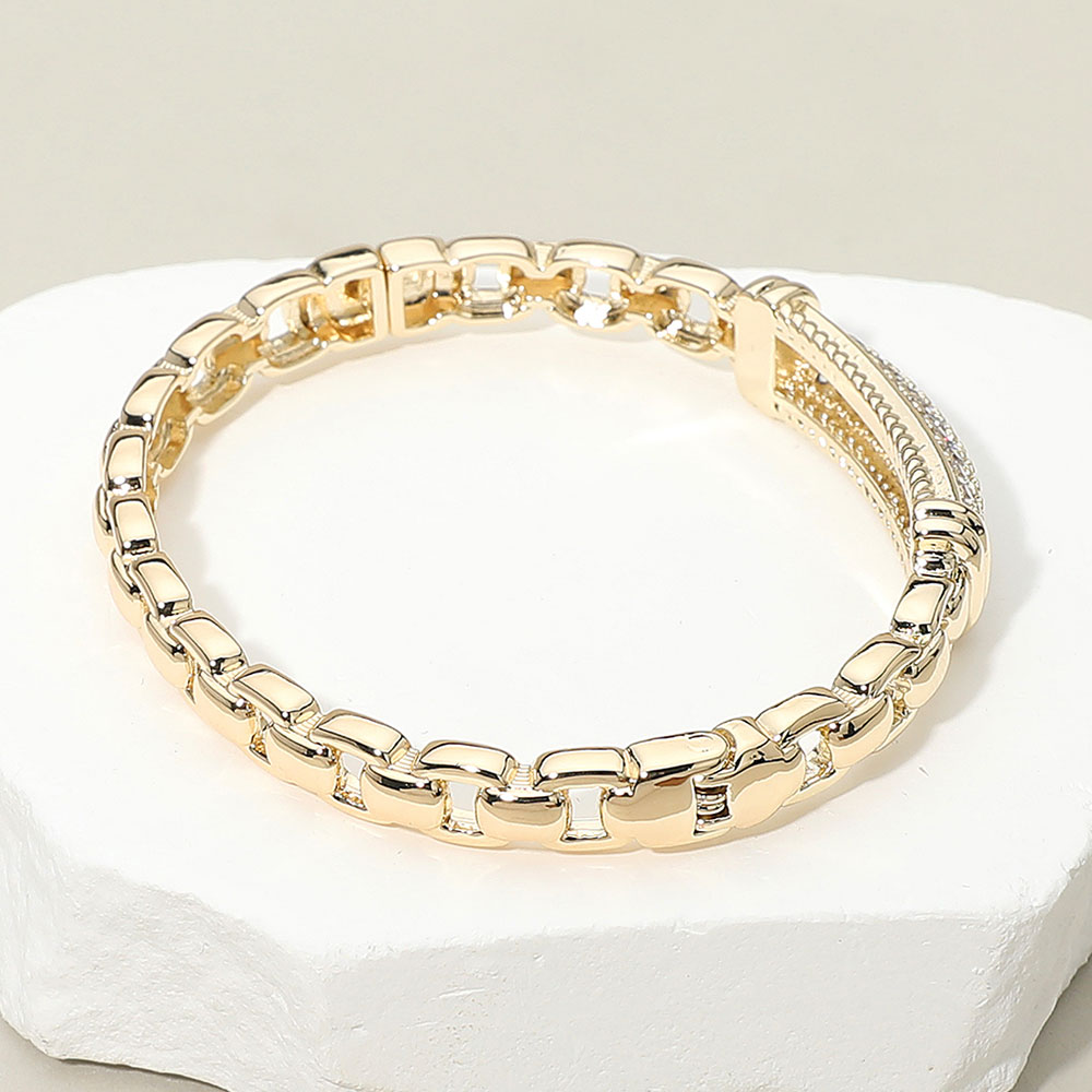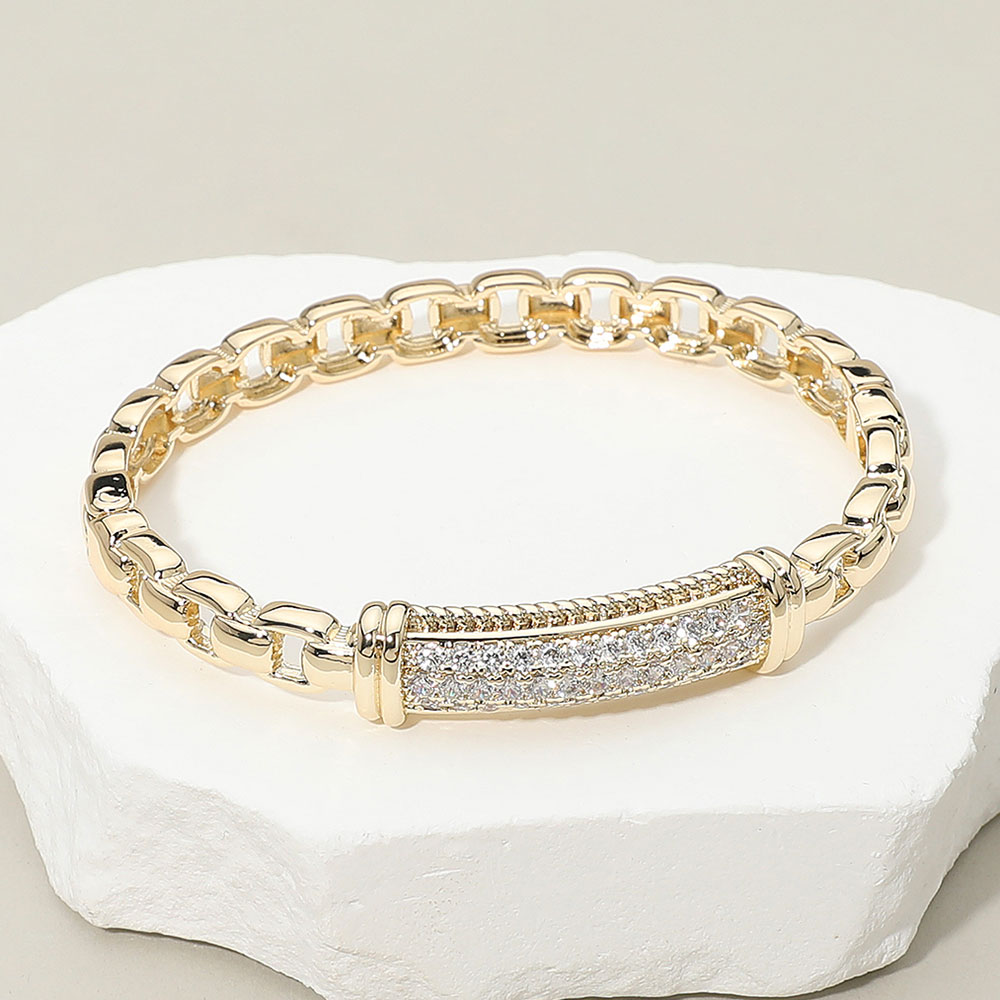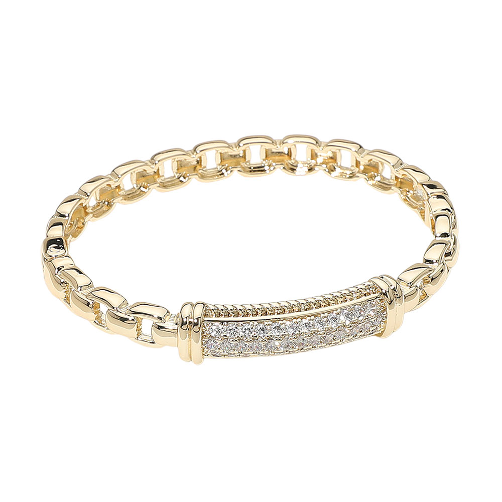 14K Gold Plated CZ Stone Paved Bar Link Hinged Bangle Bracelet