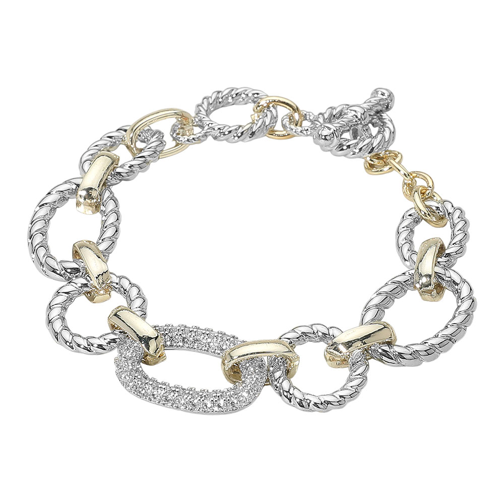 Details • Size : 0.7" H, 8" + 1" L • Toggle Closure • Elegant mixed link bracelet featuring twisted rope-style links and smooth connectors, highlighted with a shimmering pave accent. A versatile statement piece that pairs effortlessly with casual and formal looks, offering timeless style and a touch of sparkle for any jewelry collection. • Gold Dipped • CZ Cubic Zirconia