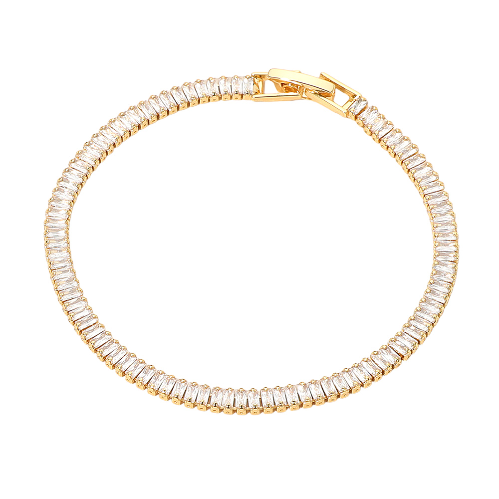 Details • Size : 0.1" H, 6.5" + 1" L • Fold Over Closure • Sophisticated baguette-cut tennis bracelet featuring a sleek row of sparkling stones and a secure clasp. Perfect for adding timeless elegance to any outfit, this bracelet offers refined brilliance and effortless glamour for both special occasions and everyday wear. • Lead and Nickel Compliant • Gold Dipped