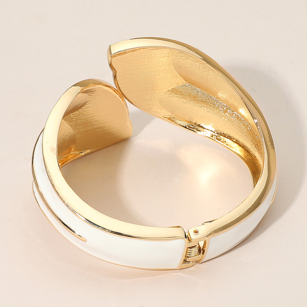• Make a sophisticated statement with this Abstract Leaf Cuff Bracelet. This wide, hinged bangle features a bold, sculptural design with two overlapping, curved leaf shapes finished in a sleek, high-gloss enamel. The smooth, shiny enamel is framed by a highly polished metallic tone, creating a striking contrast and a luxurious, dimensional look. The wide cuff style is perfect for formal events or adding a dramatic, modern touch to any outfit. It secures easily with a durable hinge closure.