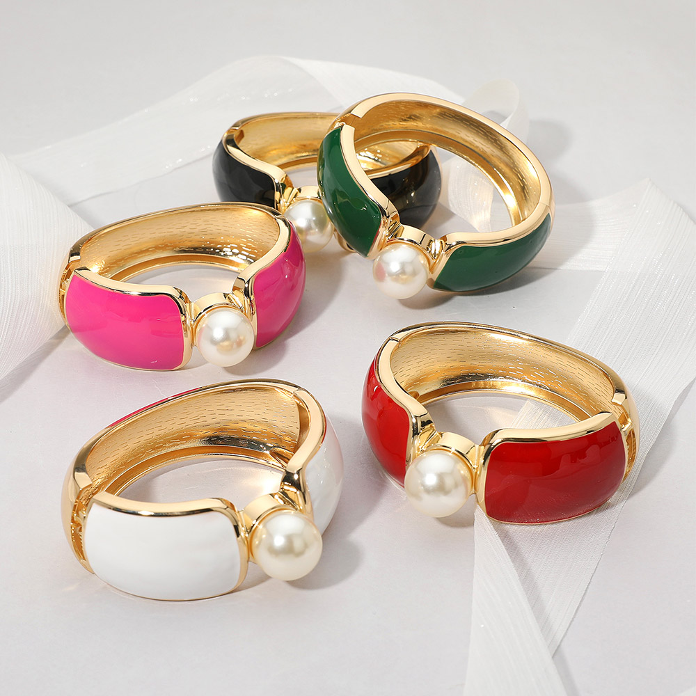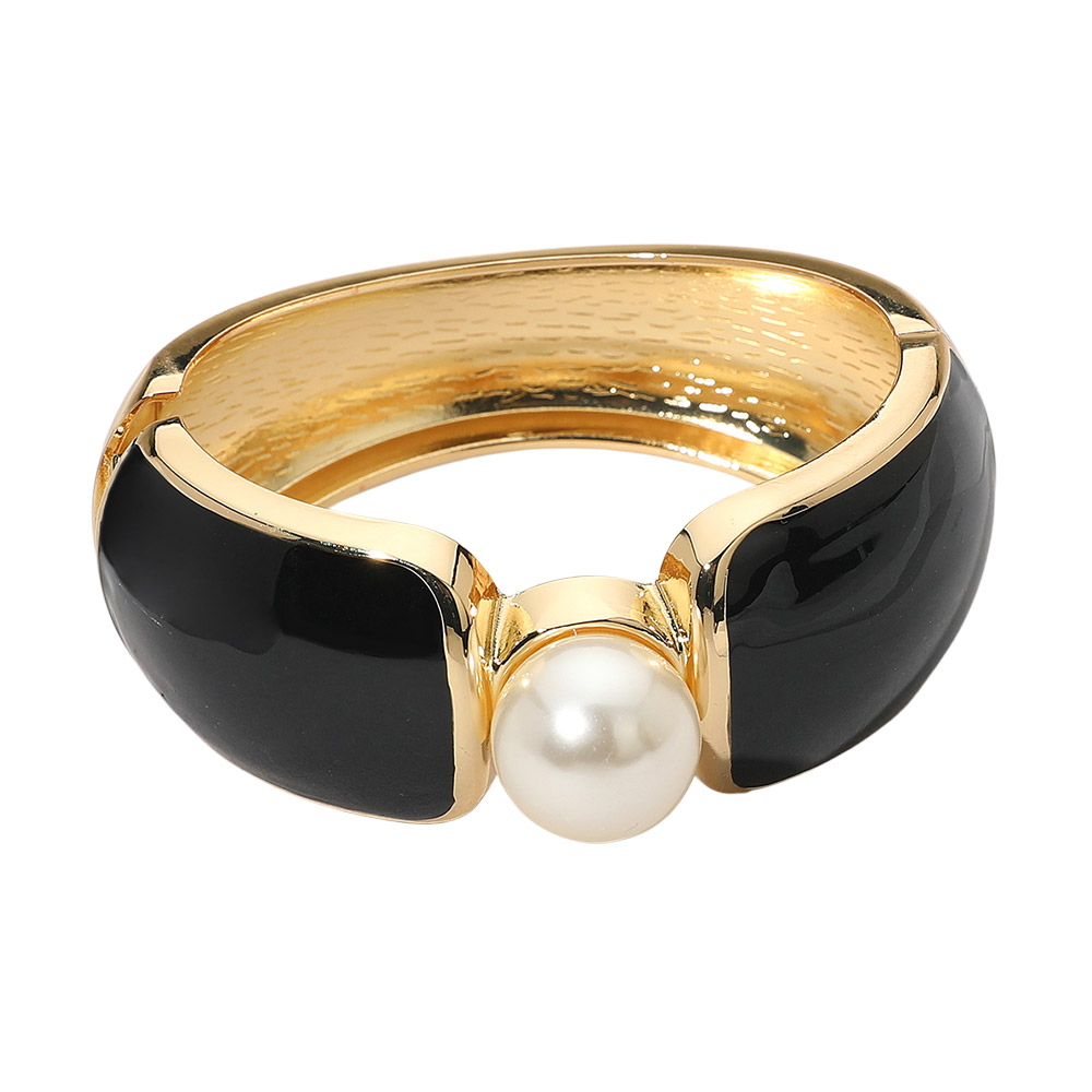 Bold Central Pearl Accent Wide Enamel Hinged Bangle Bracelet