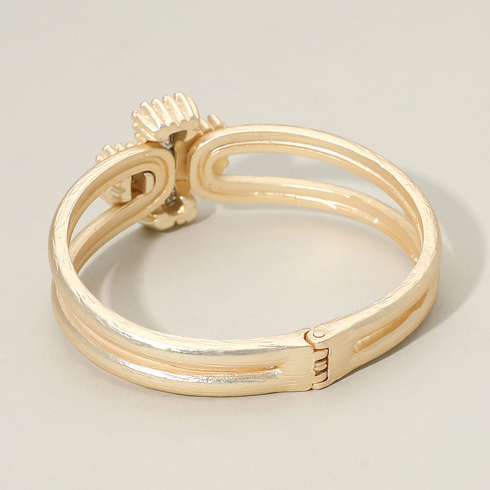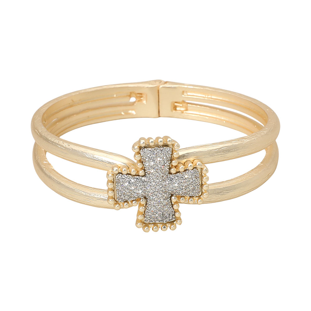 Details • Size : 1" H, 2.4" D • Hinged Closure • Chic cross hinge bracelet featuring a double band and shimmering stone accents, designed for a refined statement look. Perfect as a standout fashion accessory for dressing up casual outfits or adding polish to special occasion styles. • CZ Cubic Zirconia