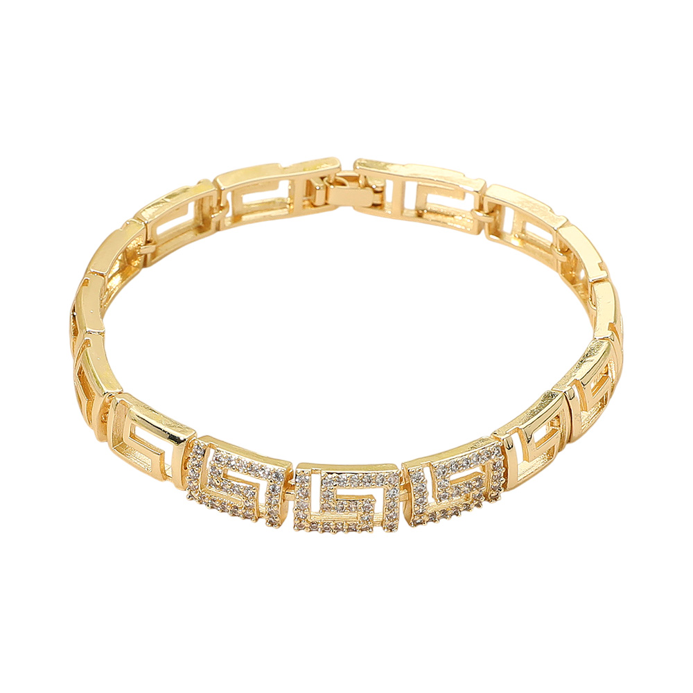 Details • Size : 0.25" H, 7.25" + 0.3" L • Fold Over Closure • Stylish geometric link bracelet designed with sleek patterns and sparkling details for a modern look. Perfect for both casual and formal occasions, this versatile accessory adds sophistication to any outfit. A timeless bracelet that enhances your jewelry collection with elegance and refined style. • Brass • CZ Cubic Zirconia • Lead and Nickel Compliant