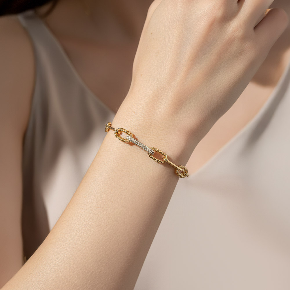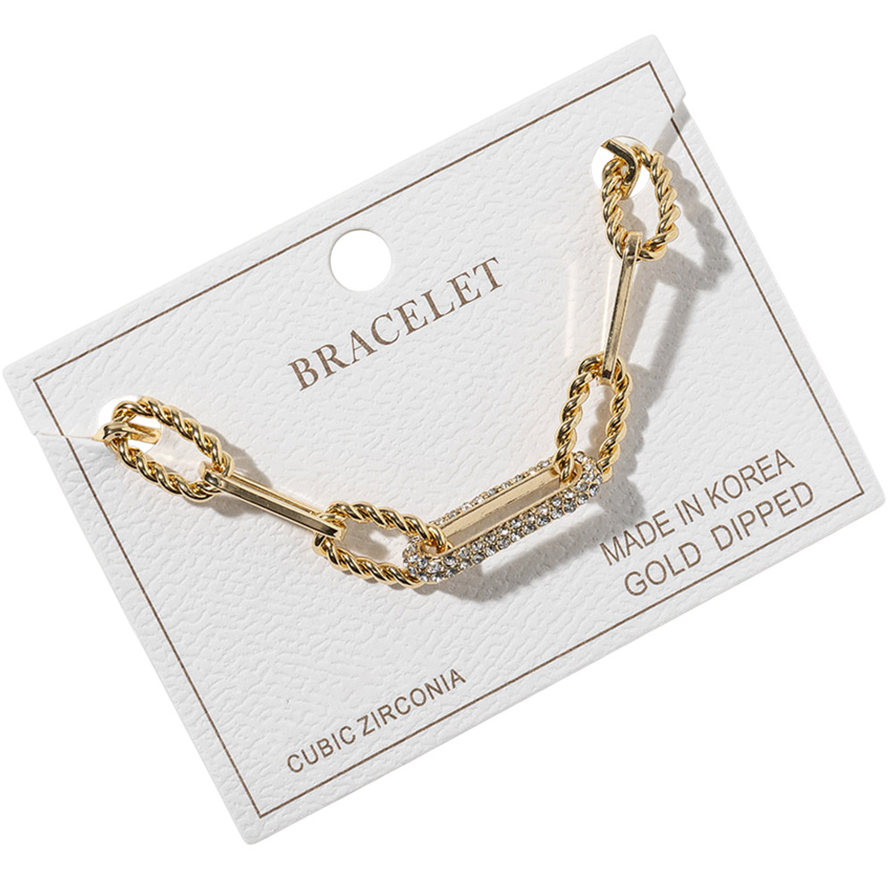 • Statement link bracelet featuring twisted chain details and a sleek bar accent with sparkling cubic zirconia. Designed for everyday wear or special occasions, this bracelet adds a refined, modern touch to layered looks and makes a versatile choice for boutique and gift collections.