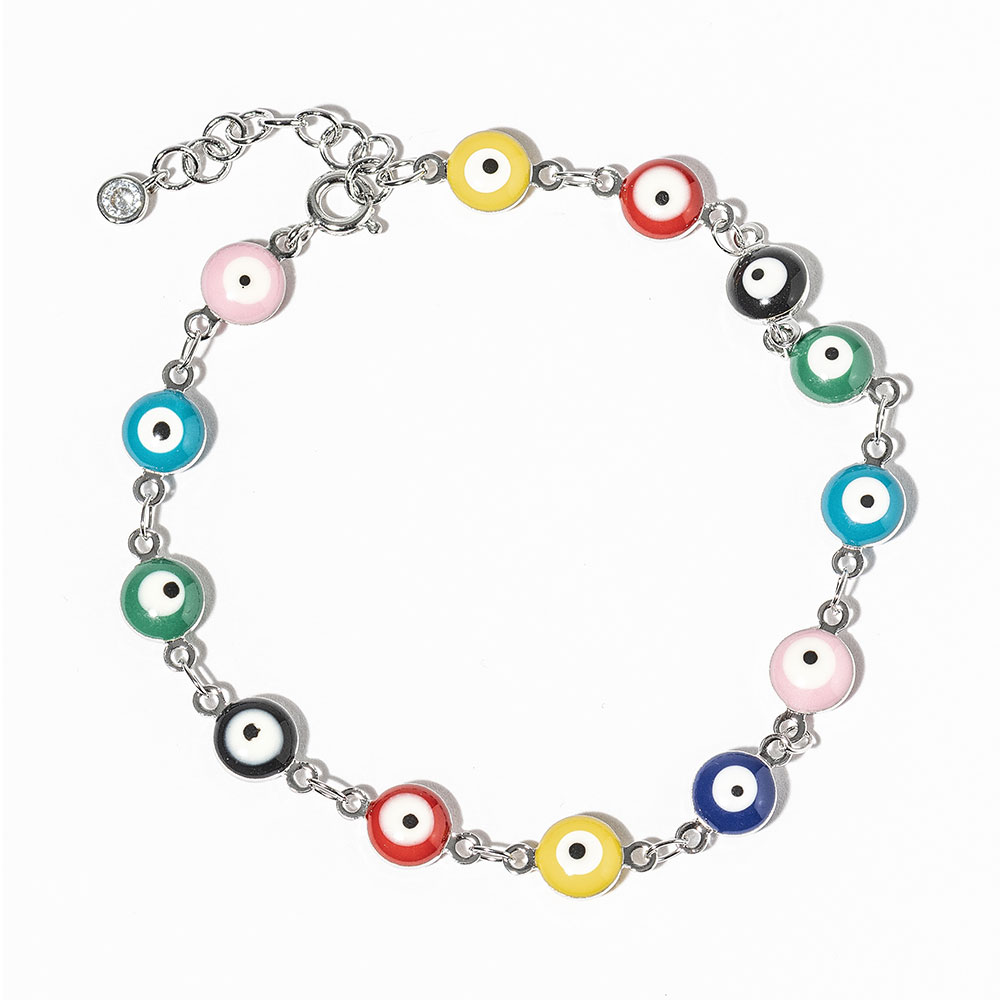 • Playful evil eye link bracelet designed with a series of round charms symbolizing protection and positivity. A chic, lightweight accessory that adds a touch of color and meaning to your look, perfect for layering or wearing solo as a trendy everyday good luck piece.