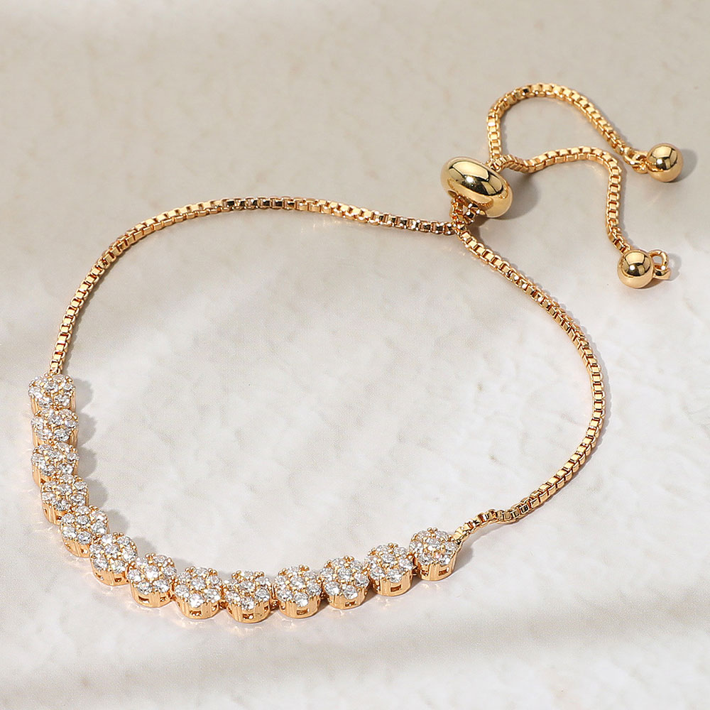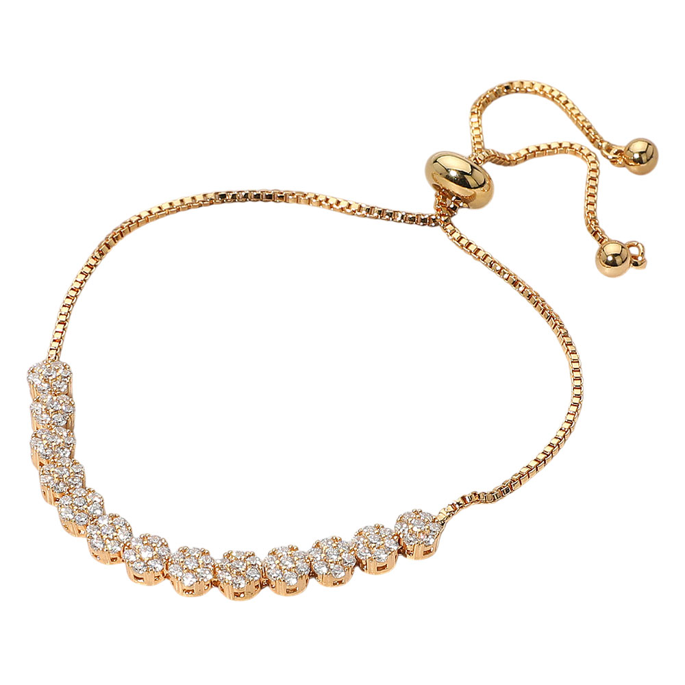 Details • Size : 0.2" H • Adjustable • Elegant adjustable slider bracelet featuring a row of dazzling stone accents for timeless brilliance. The sleek box chain design offers a comfortable, custom fit, making it perfect for layering or wearing solo as a refined statement piece for both casual and formal occasions. • CZ Cubic Zirconia • Gold Dipped