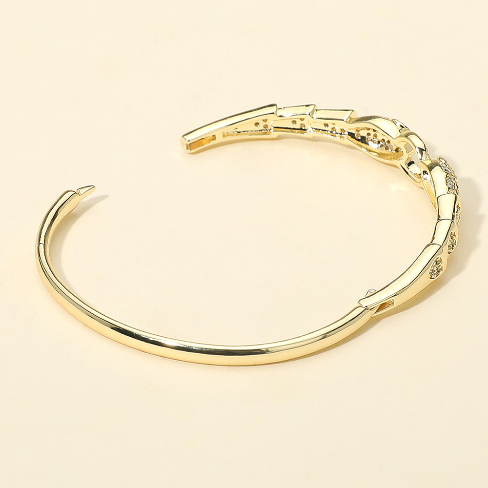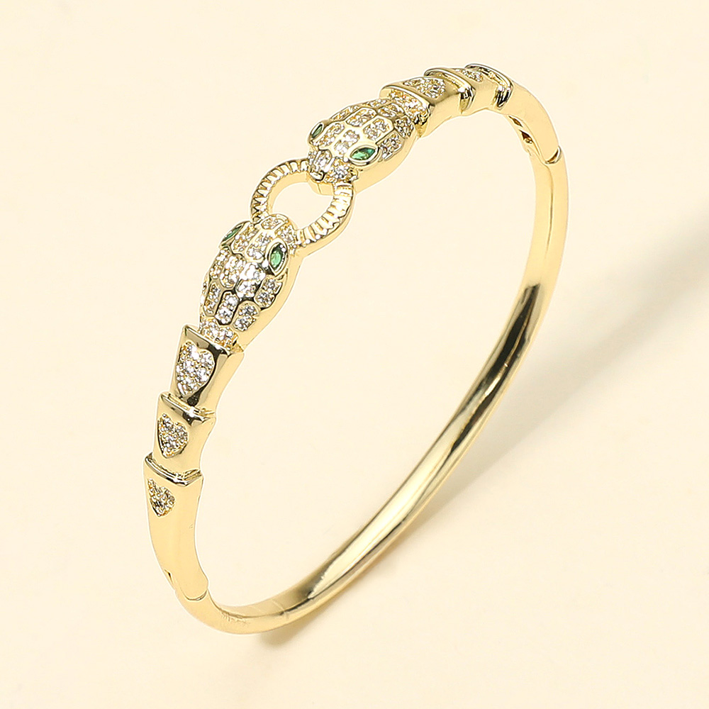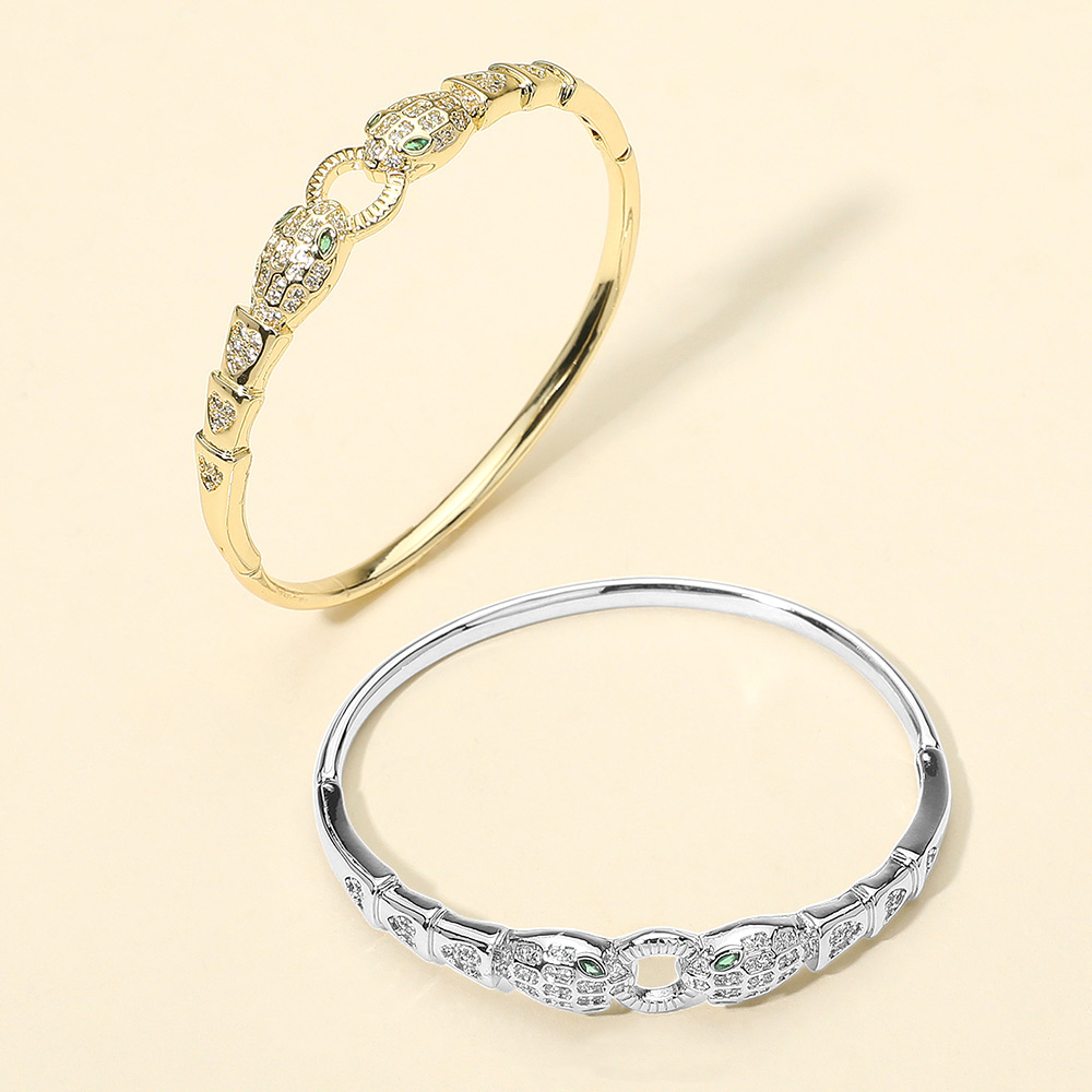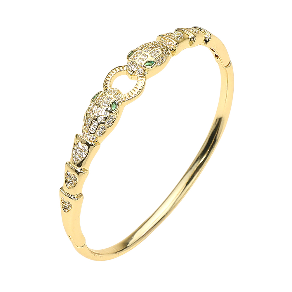 Details • Size : 0.4" H, 2.25" D • Hinged Closure • Fierce yet refined, this gold bangle bracelet showcases dual panther heads adorned with sparkling crystals and striking green eyes. A bold accessory that symbolizes strength and elegance, making it the perfect statement piece for evening looks or everyday sophistication. • CZ Cubic Zirconia • Gold Dipped