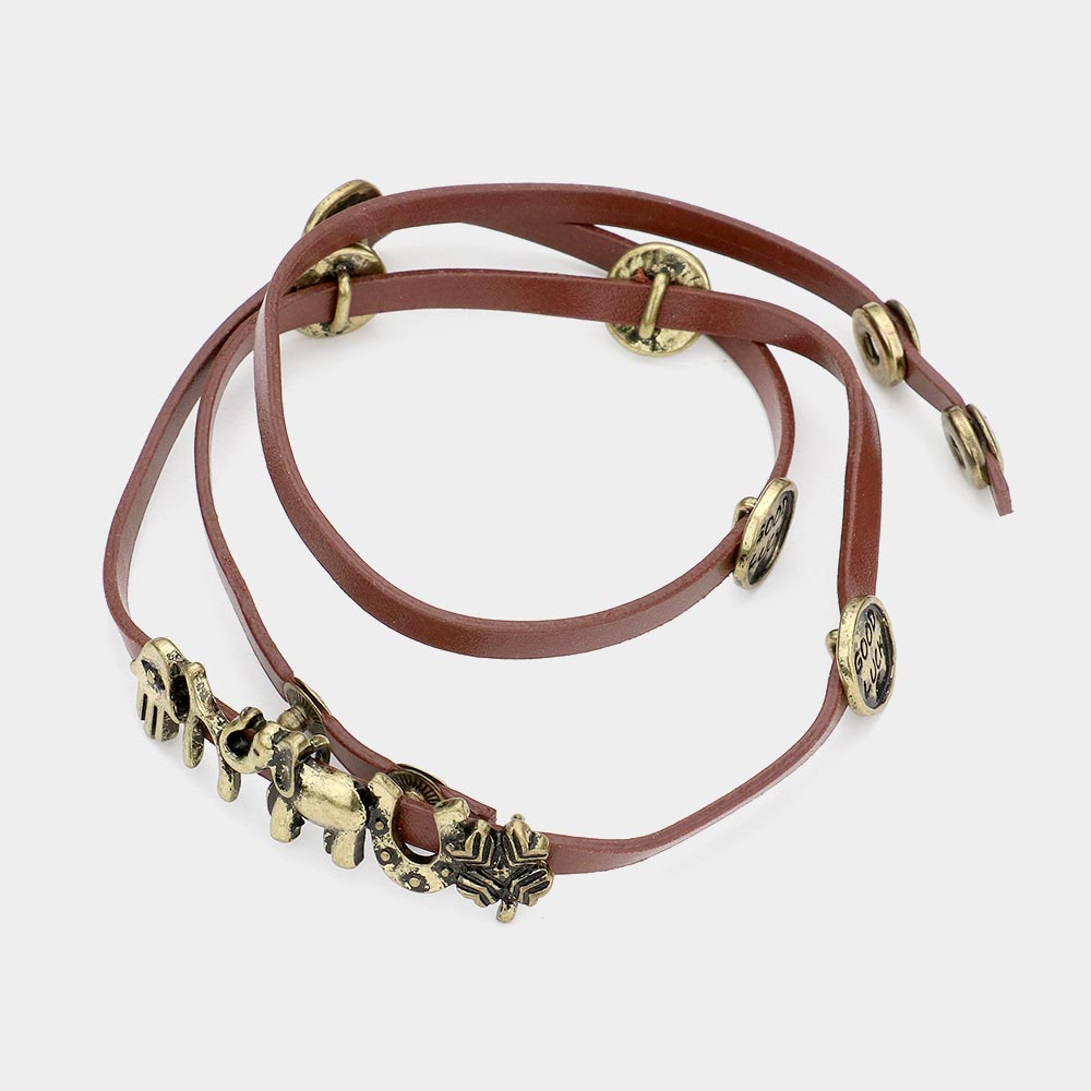 Message Disc Cluster Evil Eye Hamsa Hand Elephant Leather Wrap Bracelet
