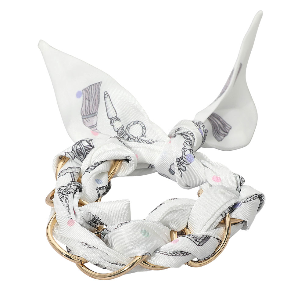 Details • Size : 1" H, 18" L • Adjustable • Print may vary • Elevate your style with this adjustable scarf bracelet featuring interlinked metallic rings wrapped in a patterned fabric tie. Its unique design combines bold details with a chic finish, making it a versatile accessory for casual looks or standout statement wear. • Lead and Nickel Compliant