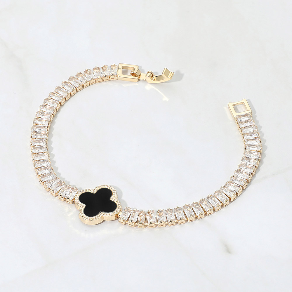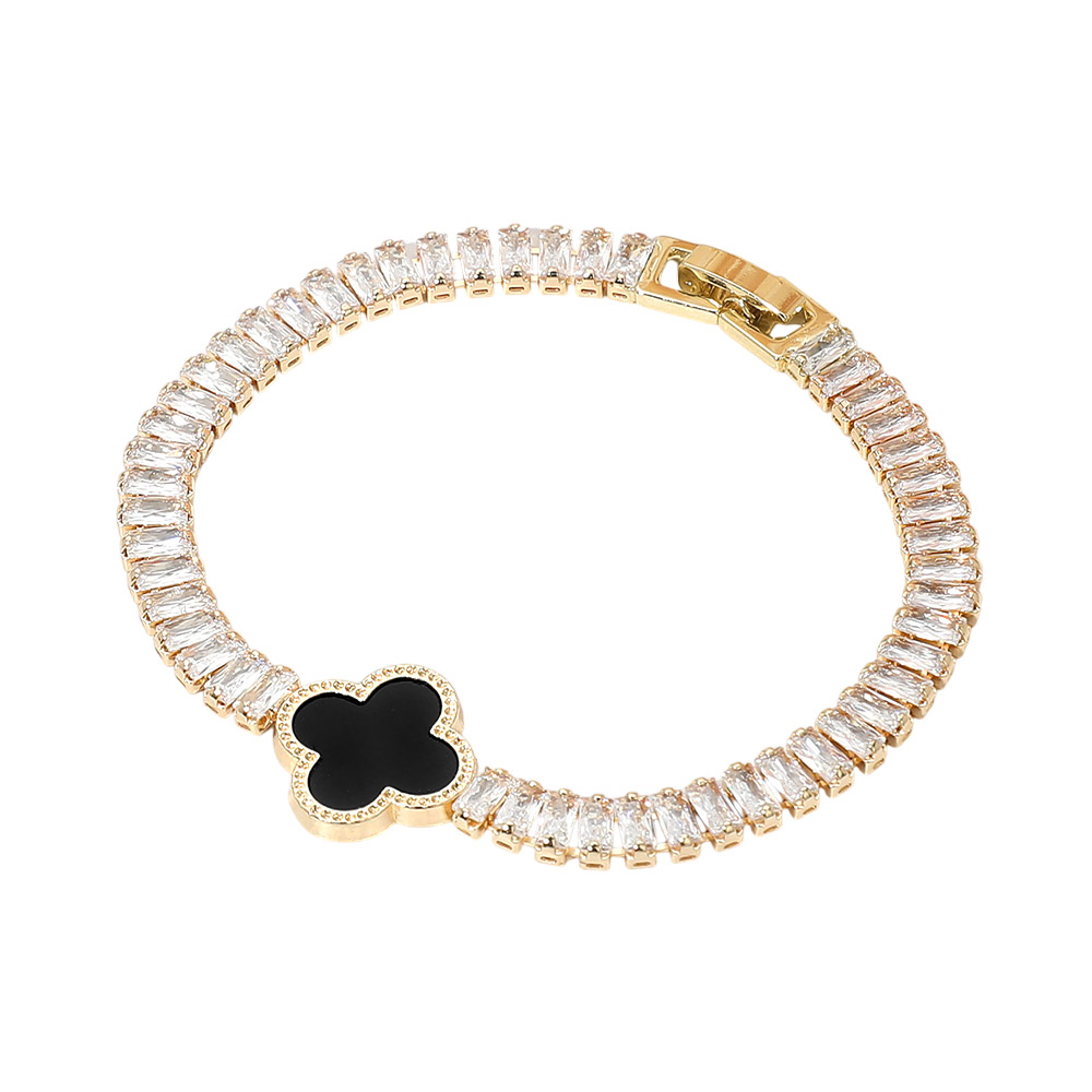 Details • Size : 0.6" H, 7.5" L • Fold Over Closure • Refined tennis style bracelet featuring a sleek quatrefoil accent that adds symbolic charm and elevated detail. Designed with a secure clasp for a polished fit, this piece is ideal for everyday elegance, special occasions, boutique assortments, and giftable jewelry collections. • Brass • CZ Cubic Zirconia