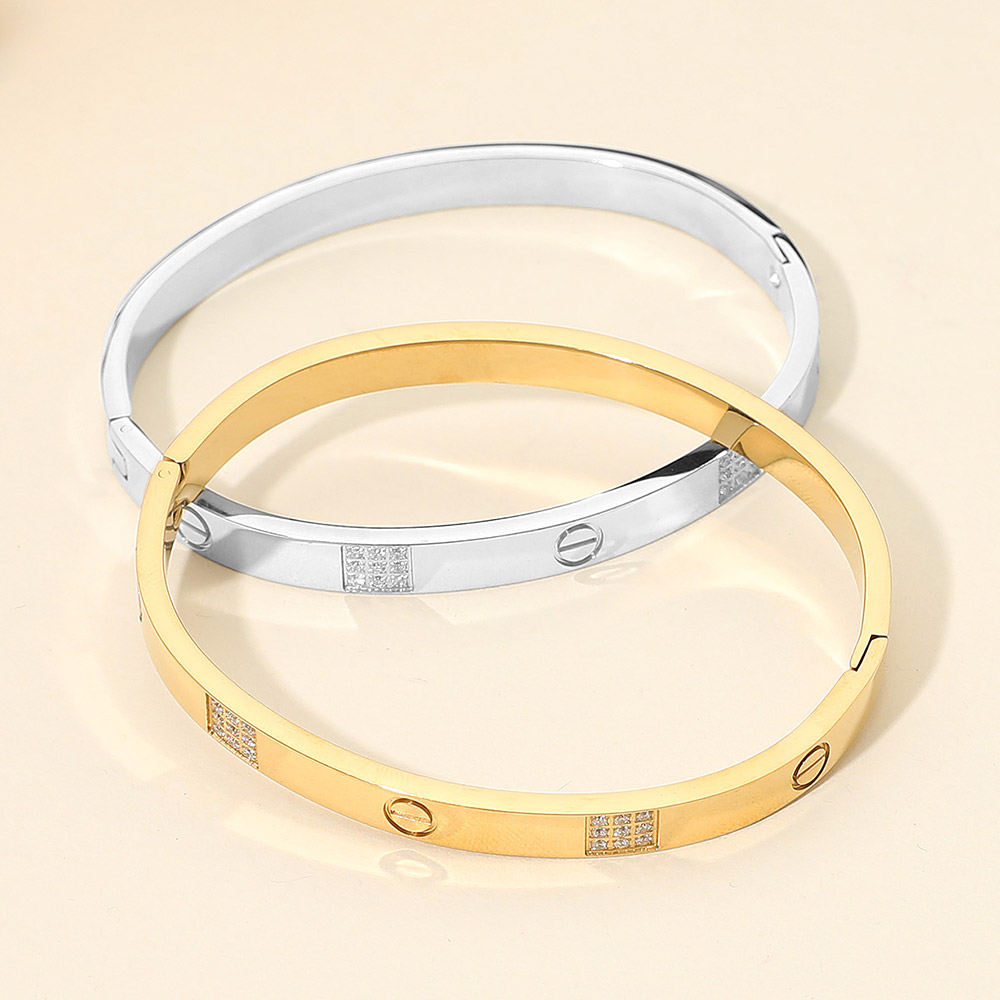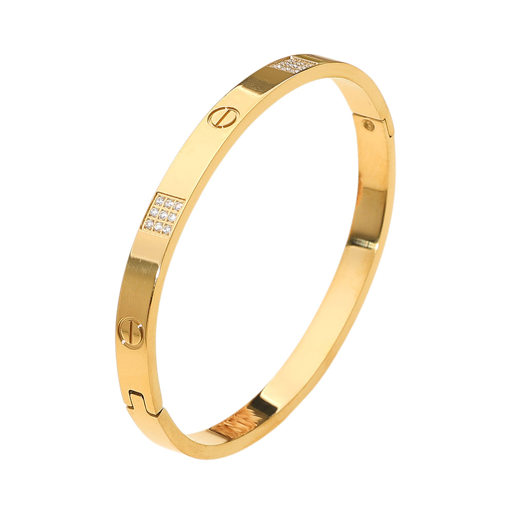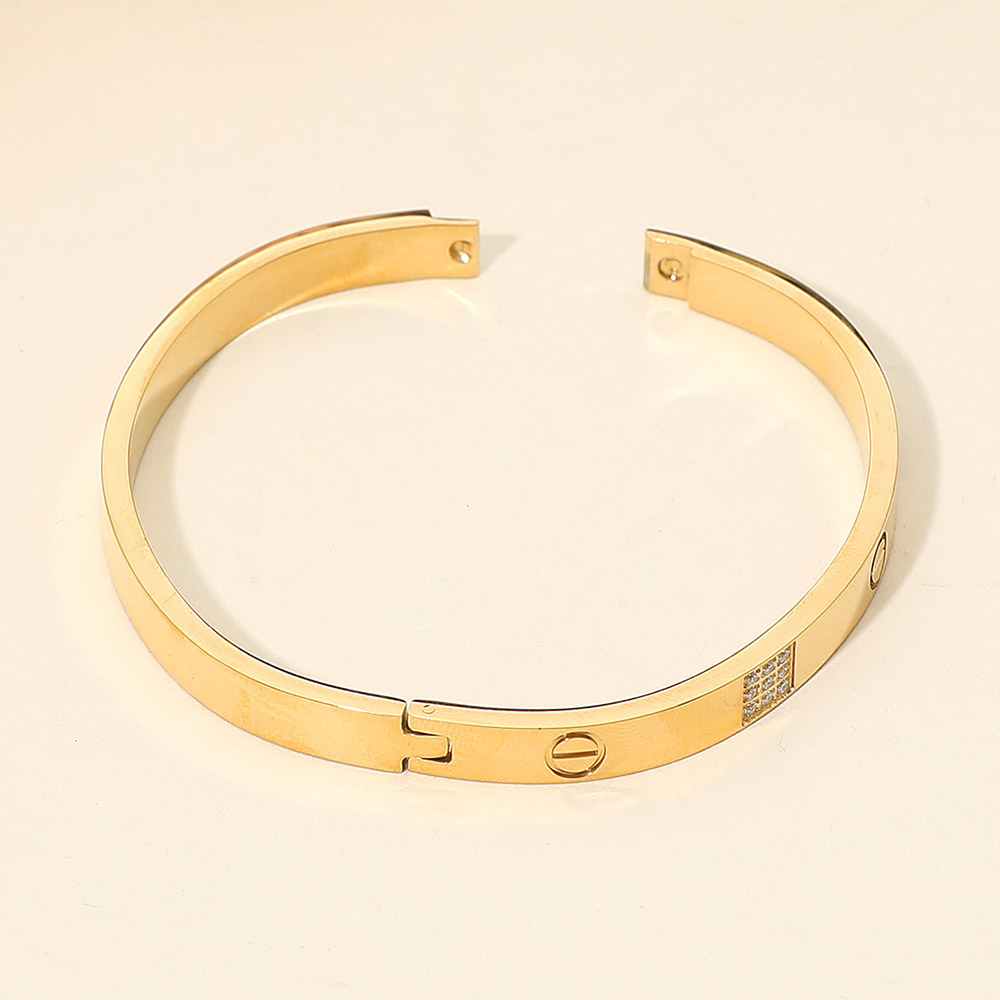 Details • Size : 0.25" H, 2.4" D • Hinged Closure • Water Resistant • Elegant hinged bangle bracelet featuring sleek geometric accents and a polished finish for a timeless, modern appeal. Perfect for both everyday wear and special occasions, this minimalist accessory adds sophistication and understated luxury to any outfit. • Hypoallergenic • Lead and Nickel Compliant