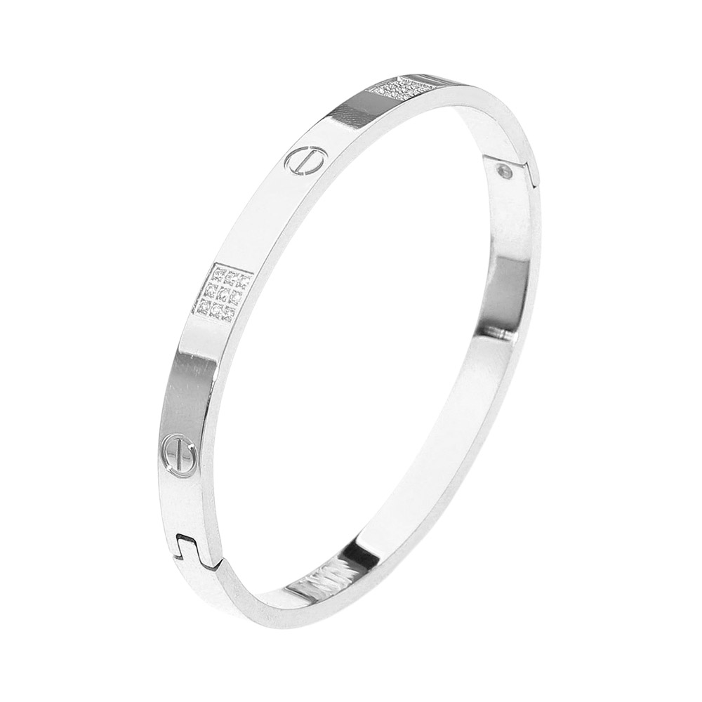 Details • Size : 0.25" H, 2.4" D • Hinged Closure • Water Resistant • Elegant hinged bangle bracelet featuring sleek geometric accents and a polished finish for a timeless, modern appeal. Perfect for both everyday wear and special occasions, this minimalist accessory adds sophistication and understated luxury to any outfit. • Hypoallergenic • Lead and Nickel Compliant