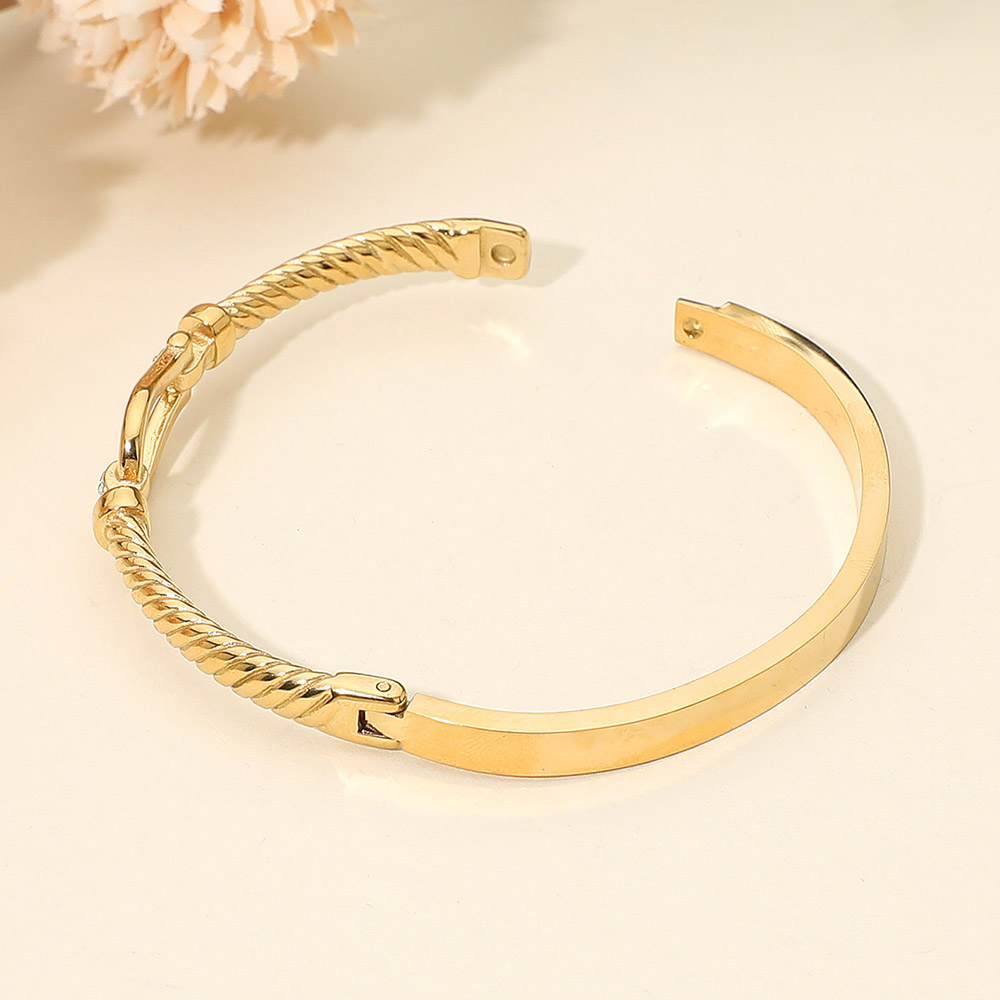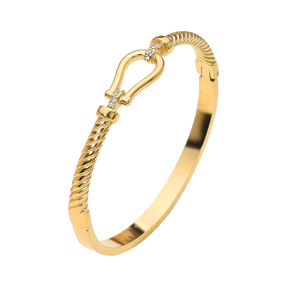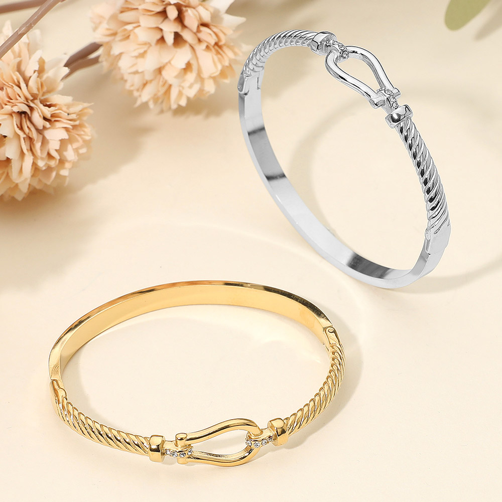 Details • Size : 0.5" H, 2.4" D • Hinged Closure • Water Resistant • Chic textured bangle bracelet featuring an elegant Horsebit buckle-style accent with a polished design. A sophisticated accessory that blends timeless style with modern charm, perfect for dressing up casual looks or adding refinement to formal outfits. • Hypoallergenic • Lead and Nickel Compliant