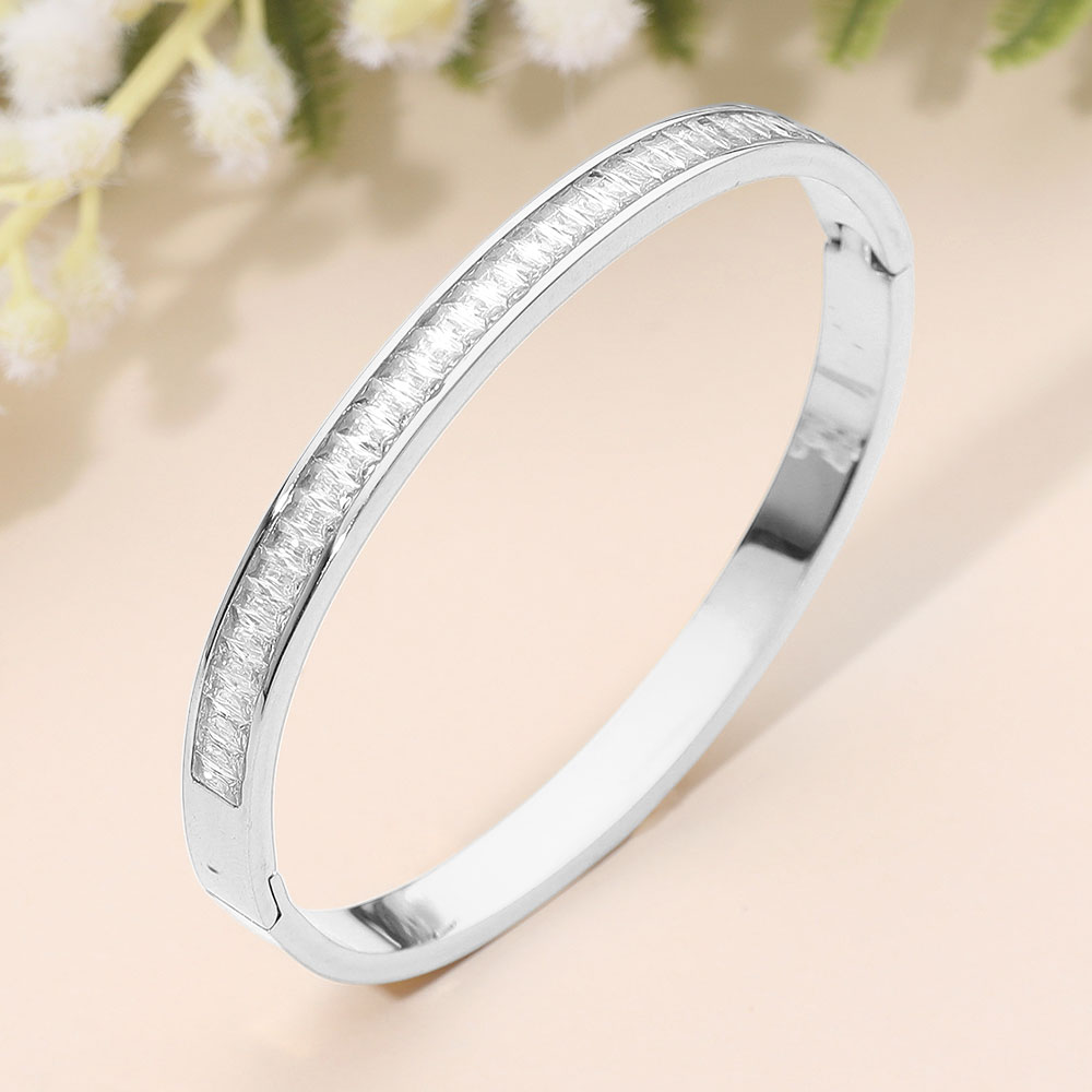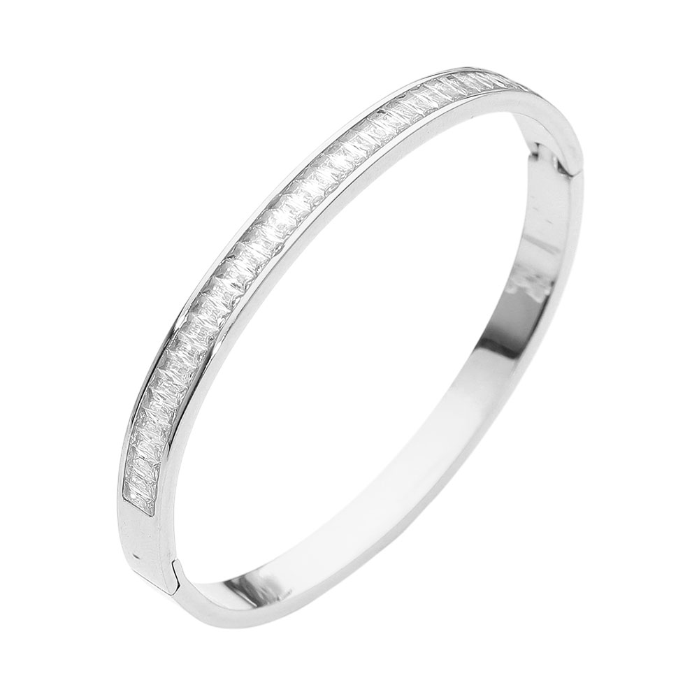 Details • Size : 0.25" H, 2.3" D • Hinged Closure • Water Resistant • Sleek hinge bangle bracelet featuring a refined row of crystal accents set along a polished silhouette for subtle sparkle and modern elegance. Designed for effortless wear, it elevates everyday outfits or completes evening looks with a timeless, sophisticated statement. • Hypoallergenic • Stainless Steel