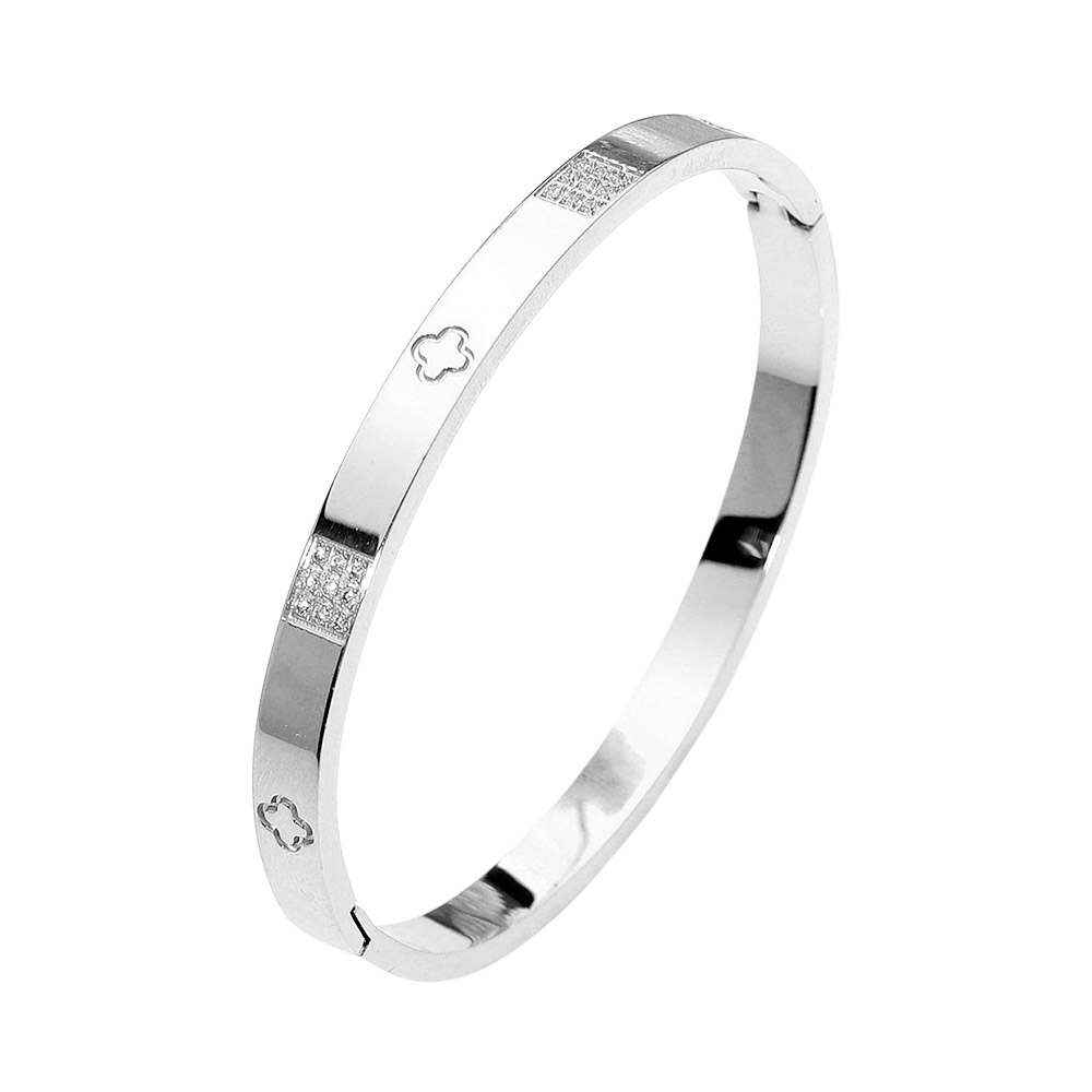 SECRET BOX_Stainless Steel Rhinestone Paved Quatrefoil Engraved Hinged Bangle Bracelet