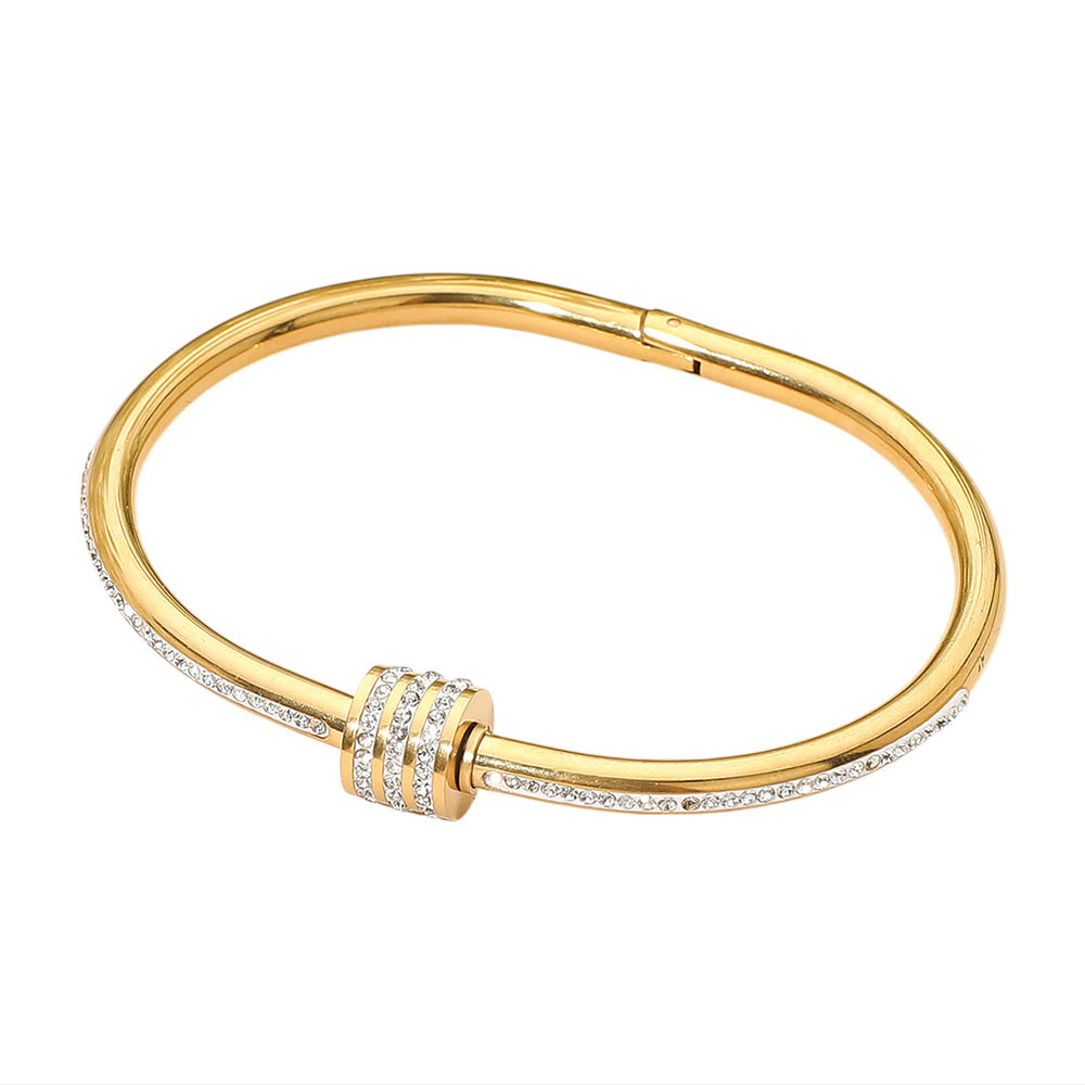 Details • Size : 0.4" H, 2.4" D • Hinged Closure • Water Resistant • Sleek hinge bangle bracelet featuring a signature crystal-accent slider bar detail for modern elegance and subtle sparkle. Designed for effortless wear, this refined accessory transitions seamlessly from everyday outfits to evening styling, delivering a polished statement worn solo or layered. • Hypoallergenic • Stainless Steel